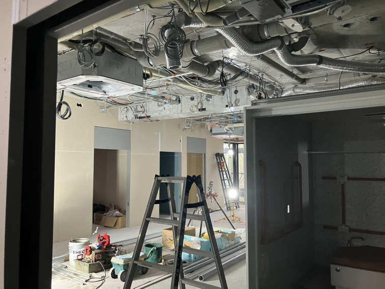今後は天井裏の整備や壁、天井のボード作業(石膏ボード等の貼り付け作業)を行う予定でございます。
