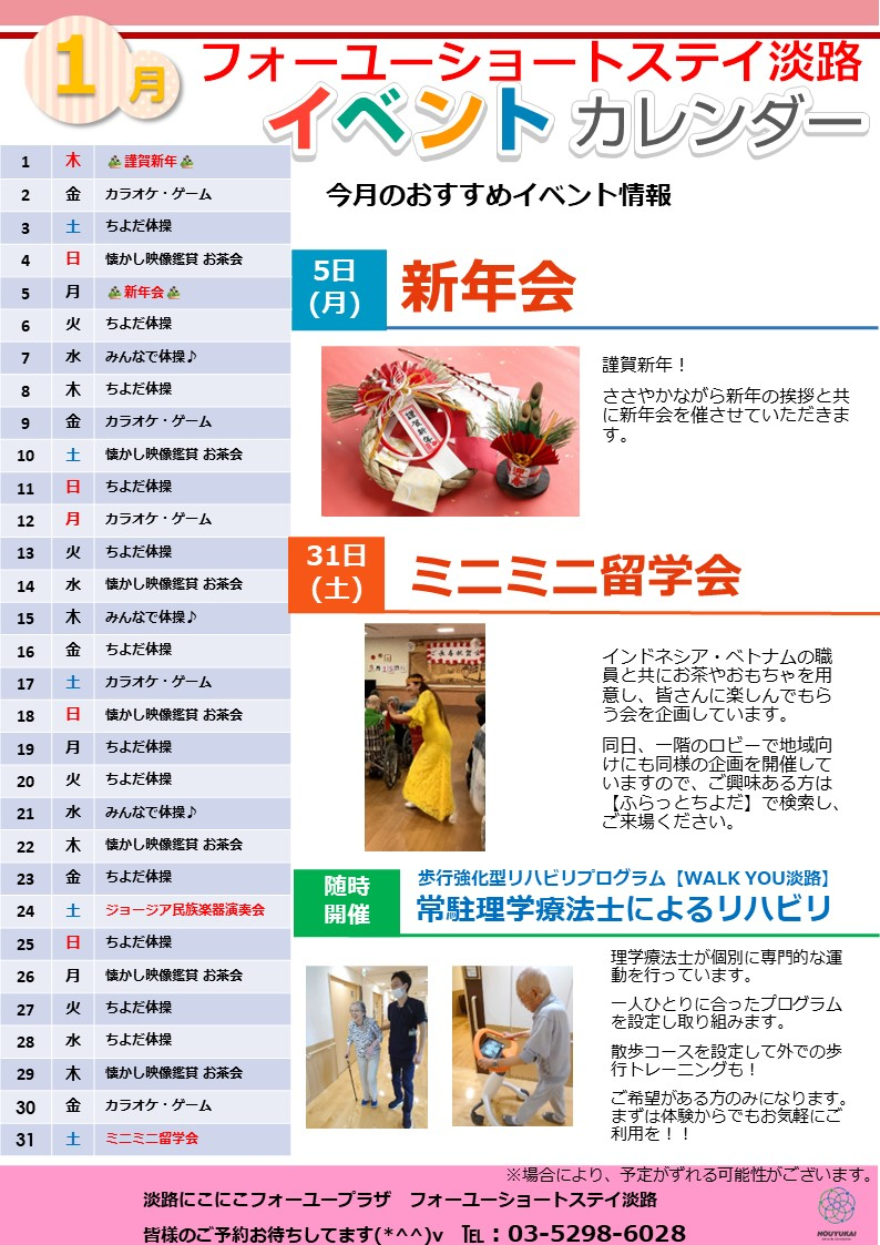 2025.12.18 お知らせ 1月イベントカレンダー Tweet シェアする 平素より当施設の運営にご理解とご協力を賜り、誠にありがとうございます。 1月のイベントカレンダーをご紹介します。 令和8年の新年会や音楽、インドネシア・ベトナムの職員によるミニミニ留学会も催しています。 みなさまのご利用をお待ちしております。 一覧へ戻る