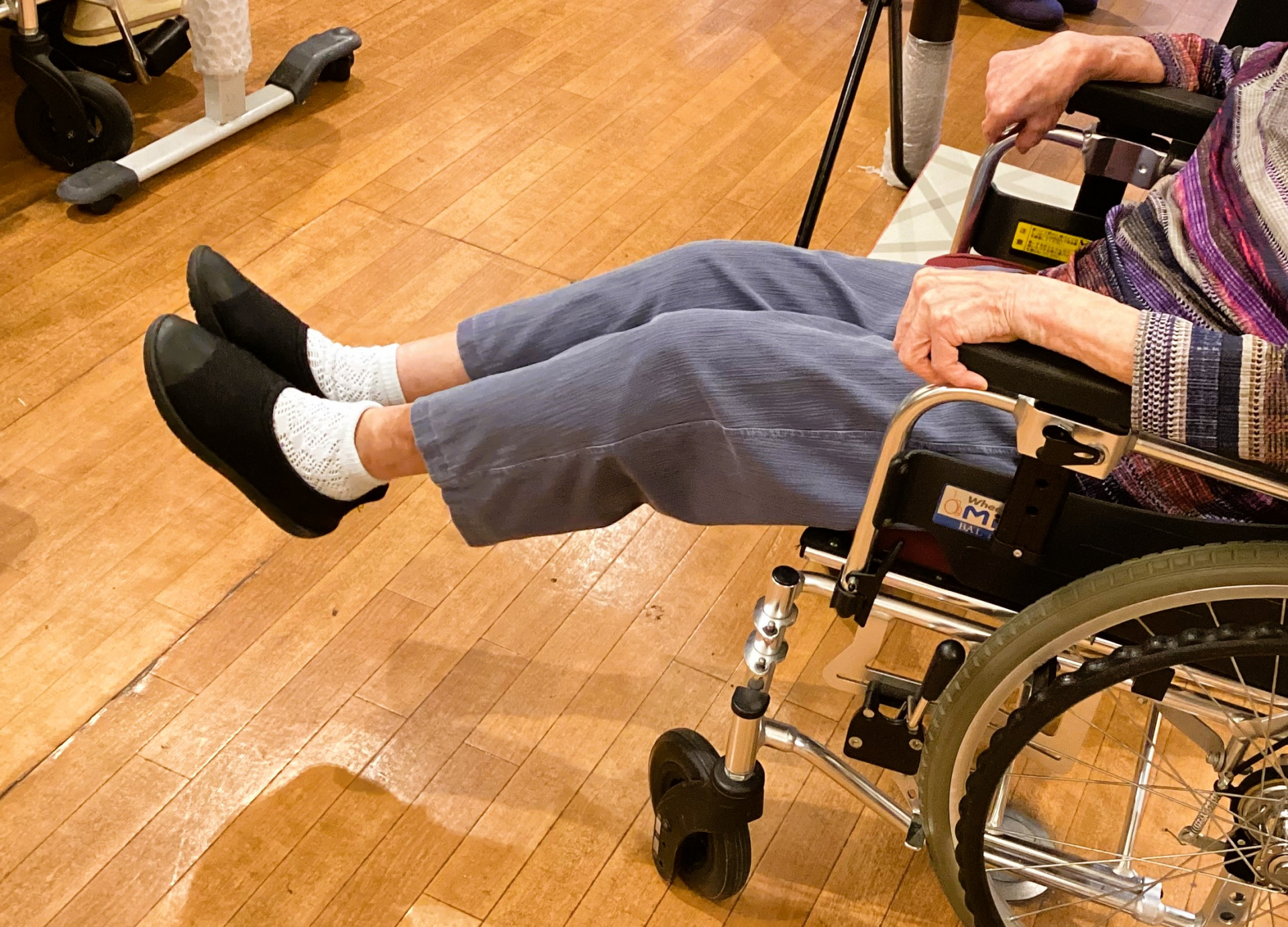 車いすの上でも足を数秒間上げてキープすることによって腹筋に