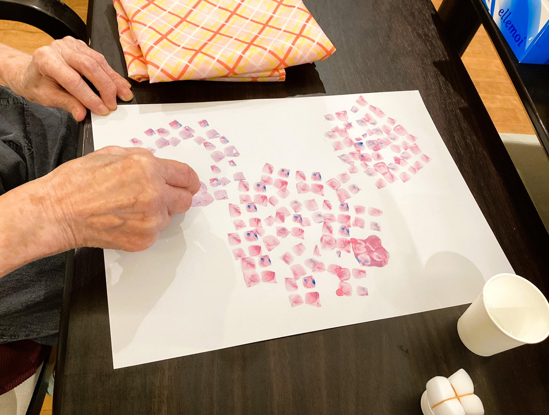 ご入居者のIさんと一緒に画用紙にスタンプしていきます!