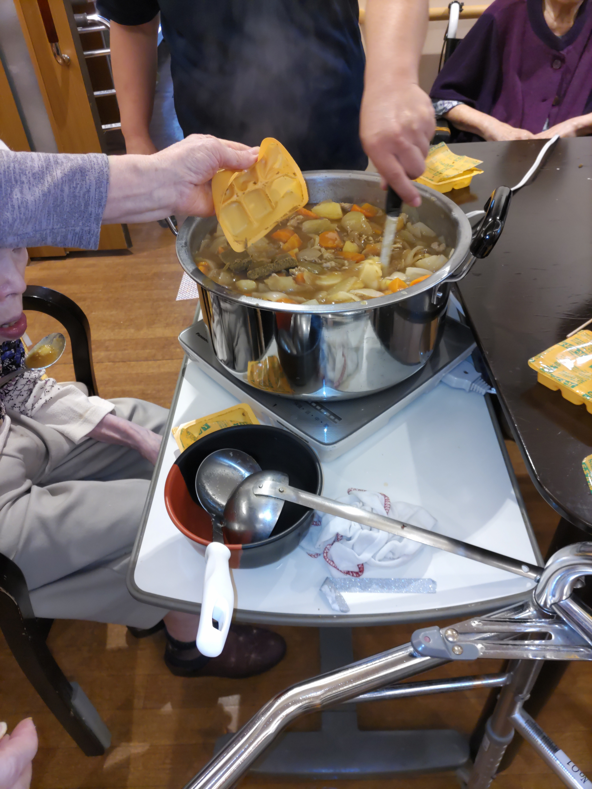 今日は、フロアの方々とカレーライス作りです。味噌汁、肉じゃがと段階を経て、カレーが作れるようになりました。野菜の皮むきも何のその。鍋いっぱいに、具材が煮えました。あとは、ルーを入れて、仕上げるのみ。焦がさないように、だまにならないように、お願いします(^^♪ 支援課 管理栄養士 K.O
