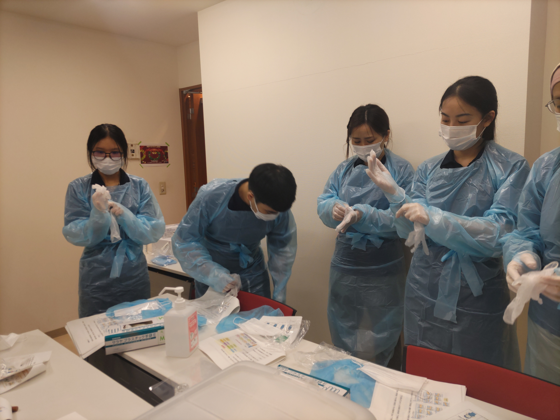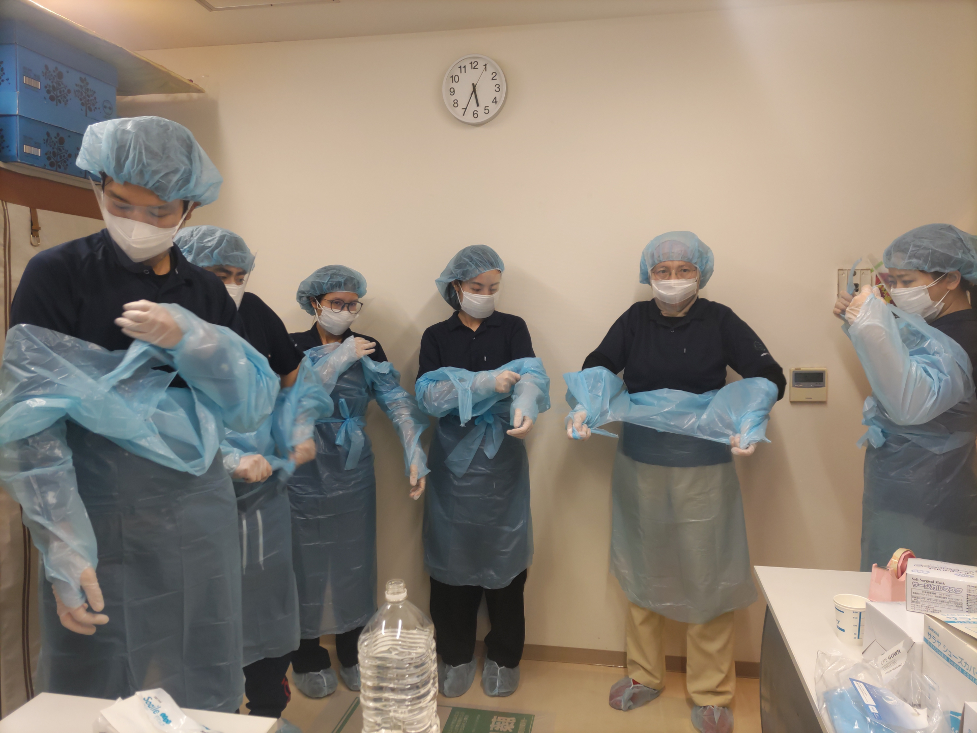 看護師さんが講師を務め、EPAの方々を中心に、個人防護具の装着方法から、嘔吐物の処理方法までを学びました。これから冬に向けて、リスクが高くなるので、しっかり学習しておきましょう! 支援課 管理栄養士 K.O