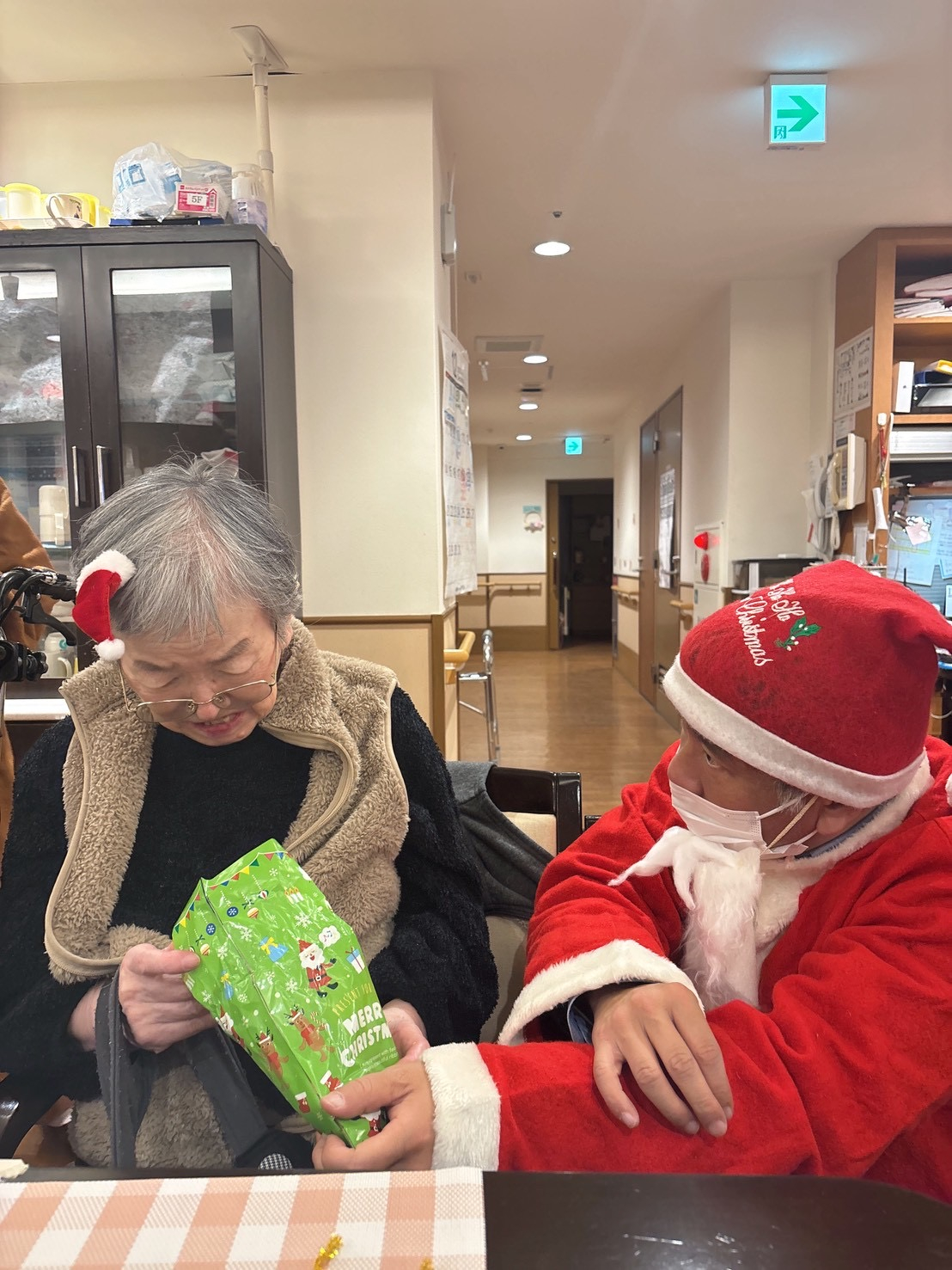 サンタ帽に緑のジャケット