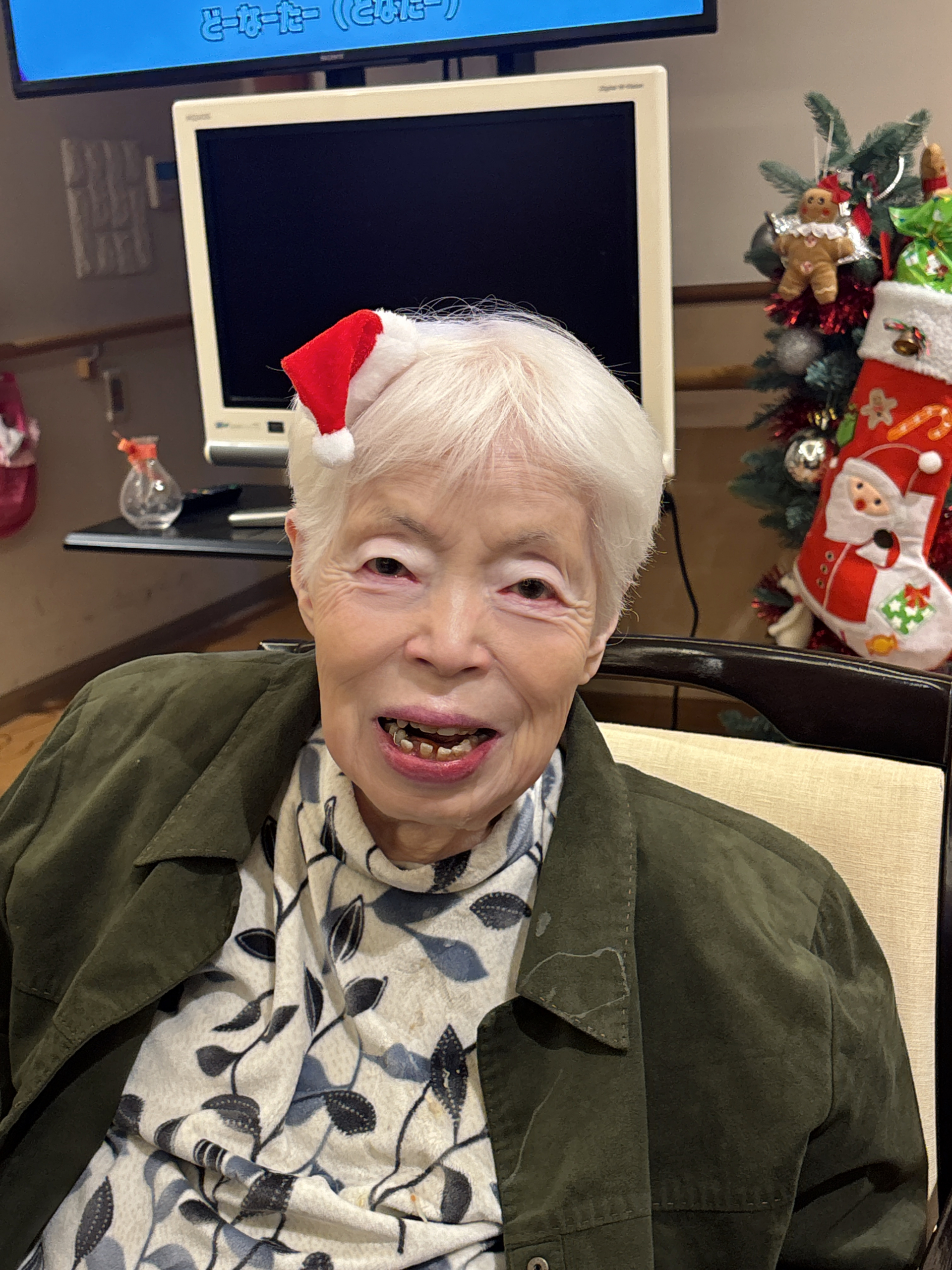 サンタの帽子の髪飾り、似合ってます。 待ち遠しいですね。心踊る気分。タッタタラリラ。