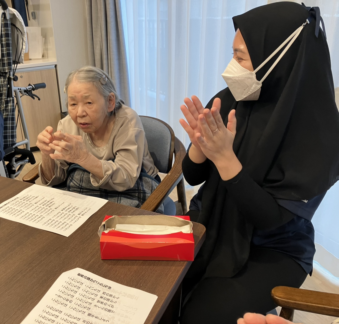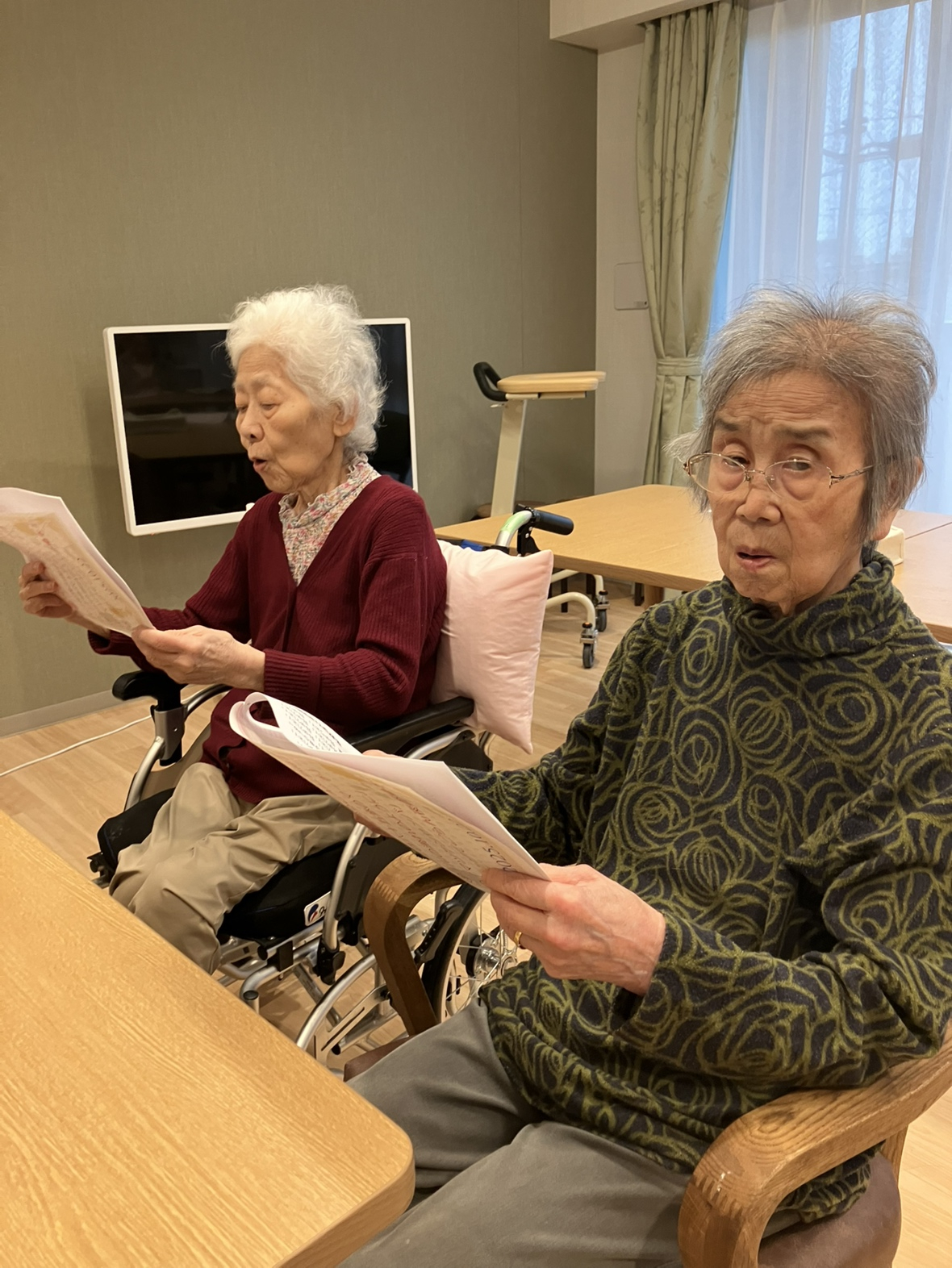 みなさん、体を動かし、大きな口をあけながら「懐かしい!」「これは知ってるわ」「歌うのなんて何年ぶりかしら」と楽しい30分を過ごしました。