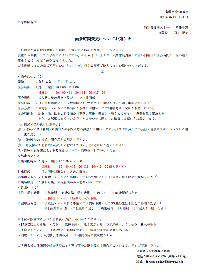 度重なるお願いとなり恐縮でございますが、令和6年11月より、人員体制見直しに伴い日曜日の面会時間を