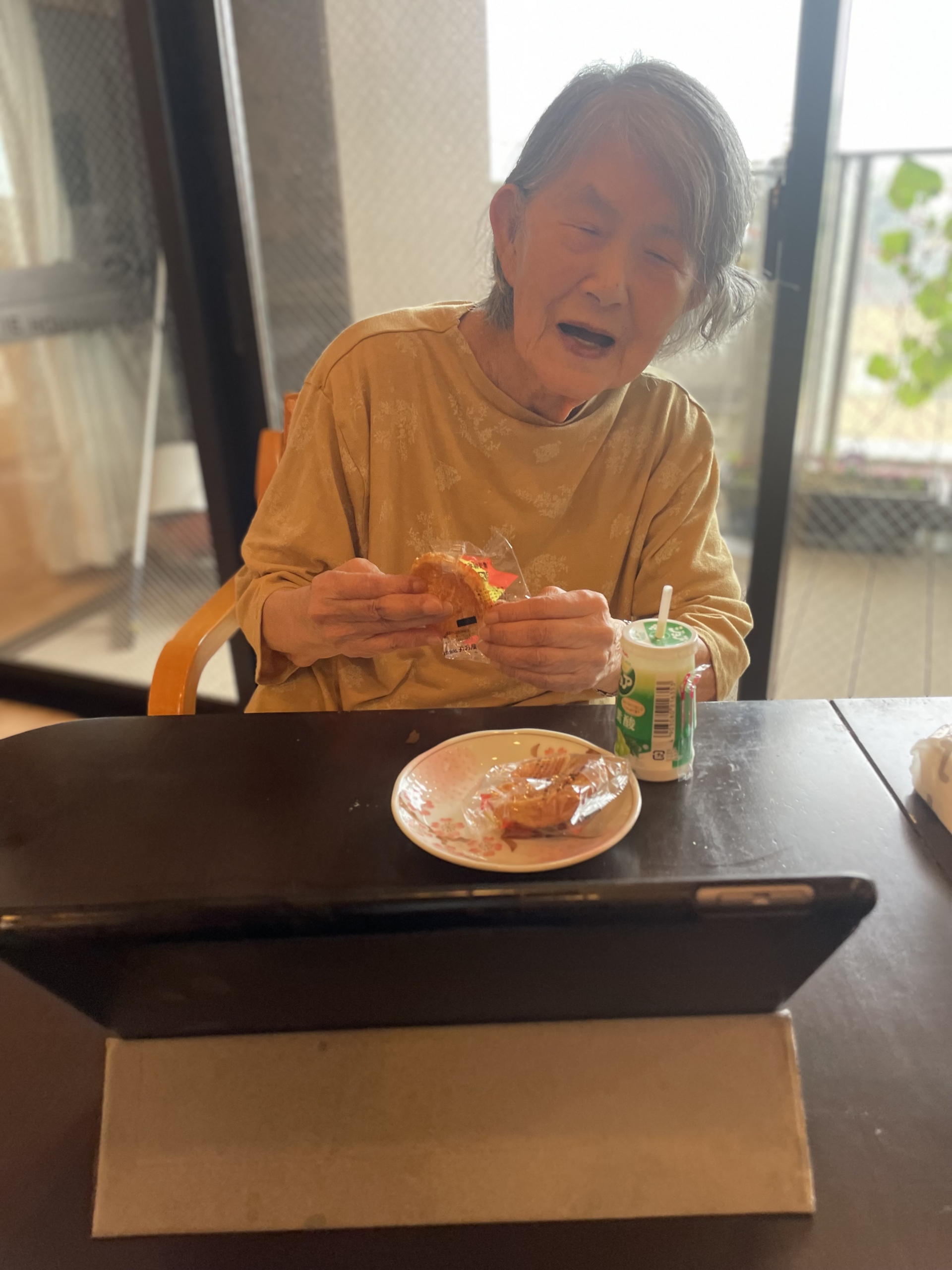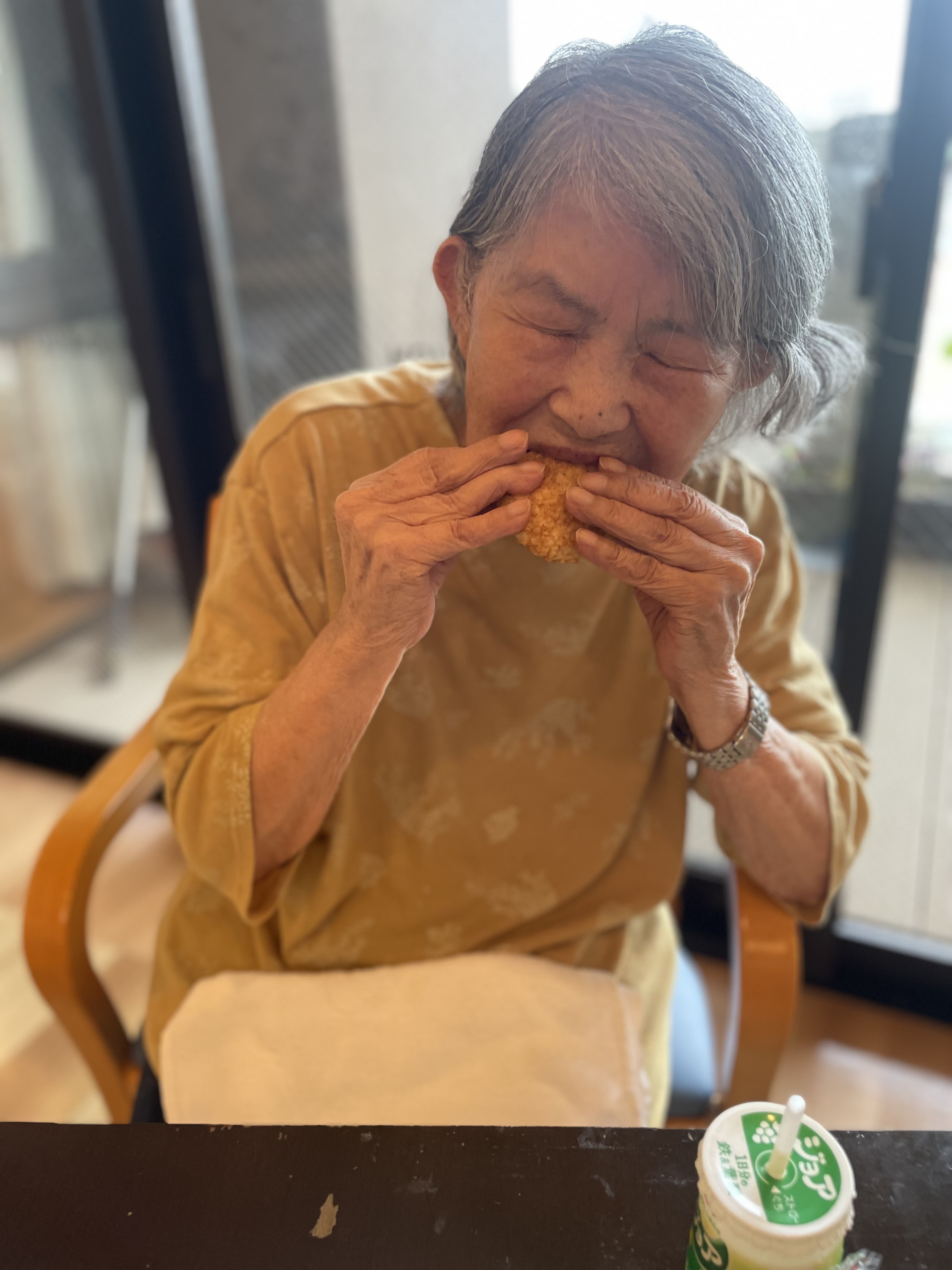 このかたはいつも同じおやつのメニューで、大好きな歌舞伎揚げを召し上がります(^^♪