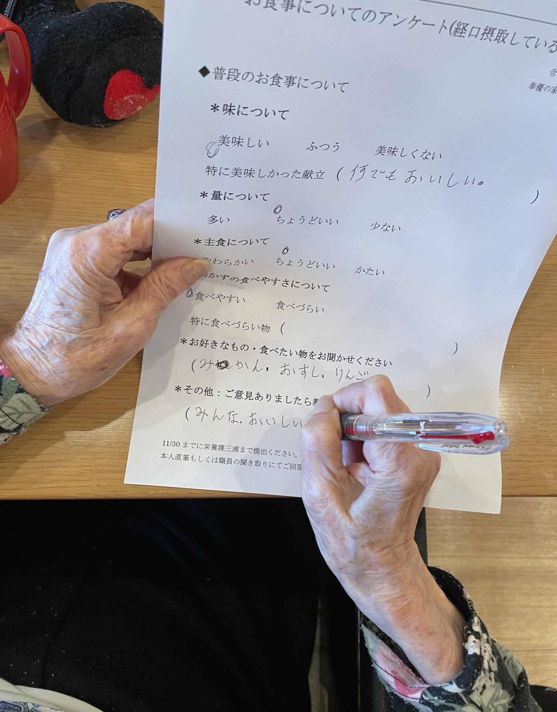 お食事についてのアンケートをこたえていただいた時の様子を紹介します。
