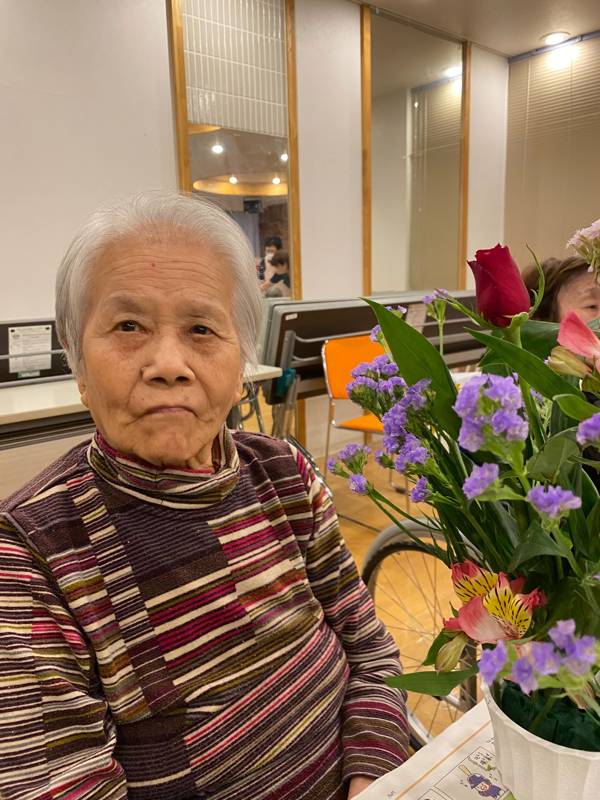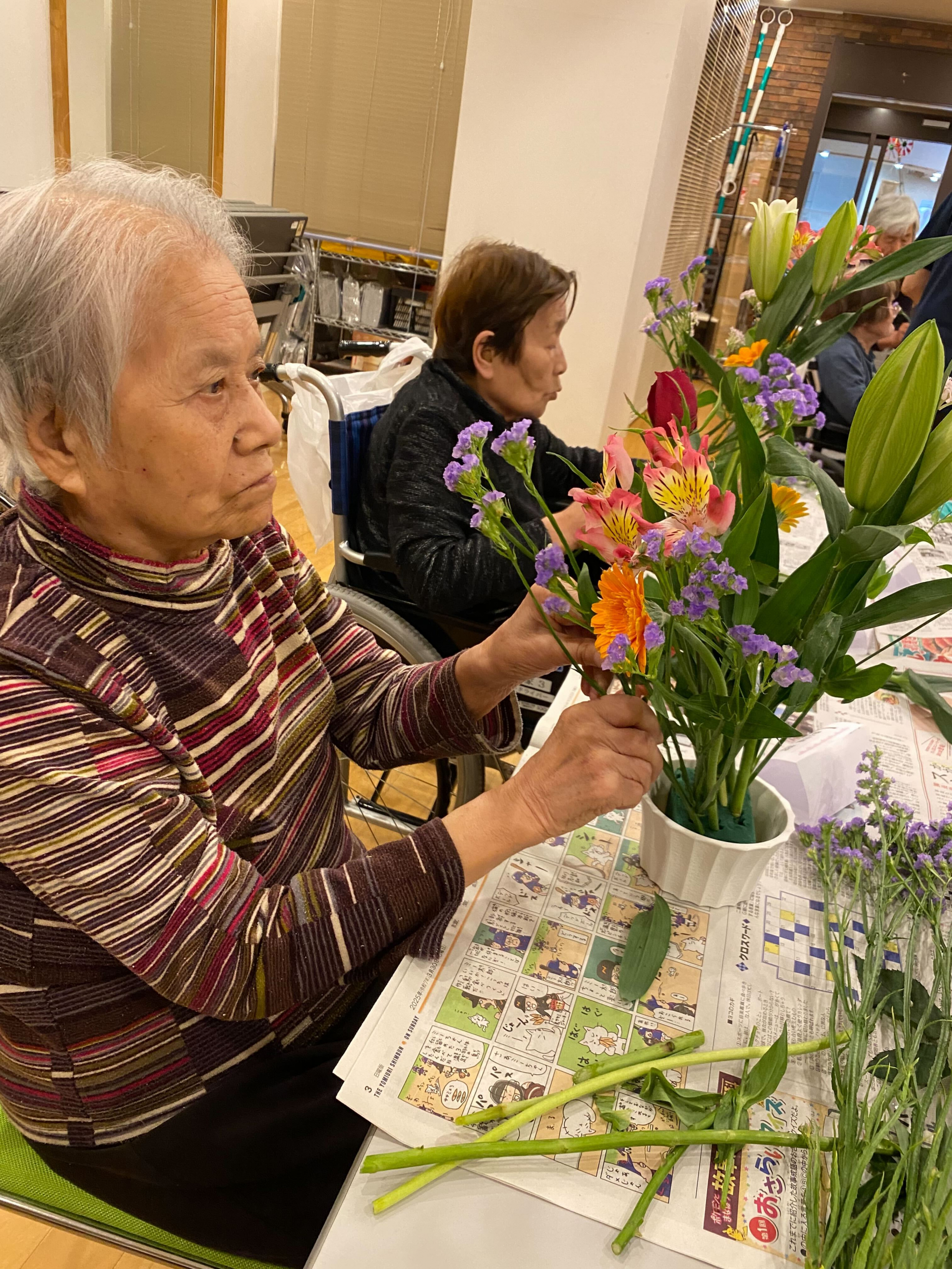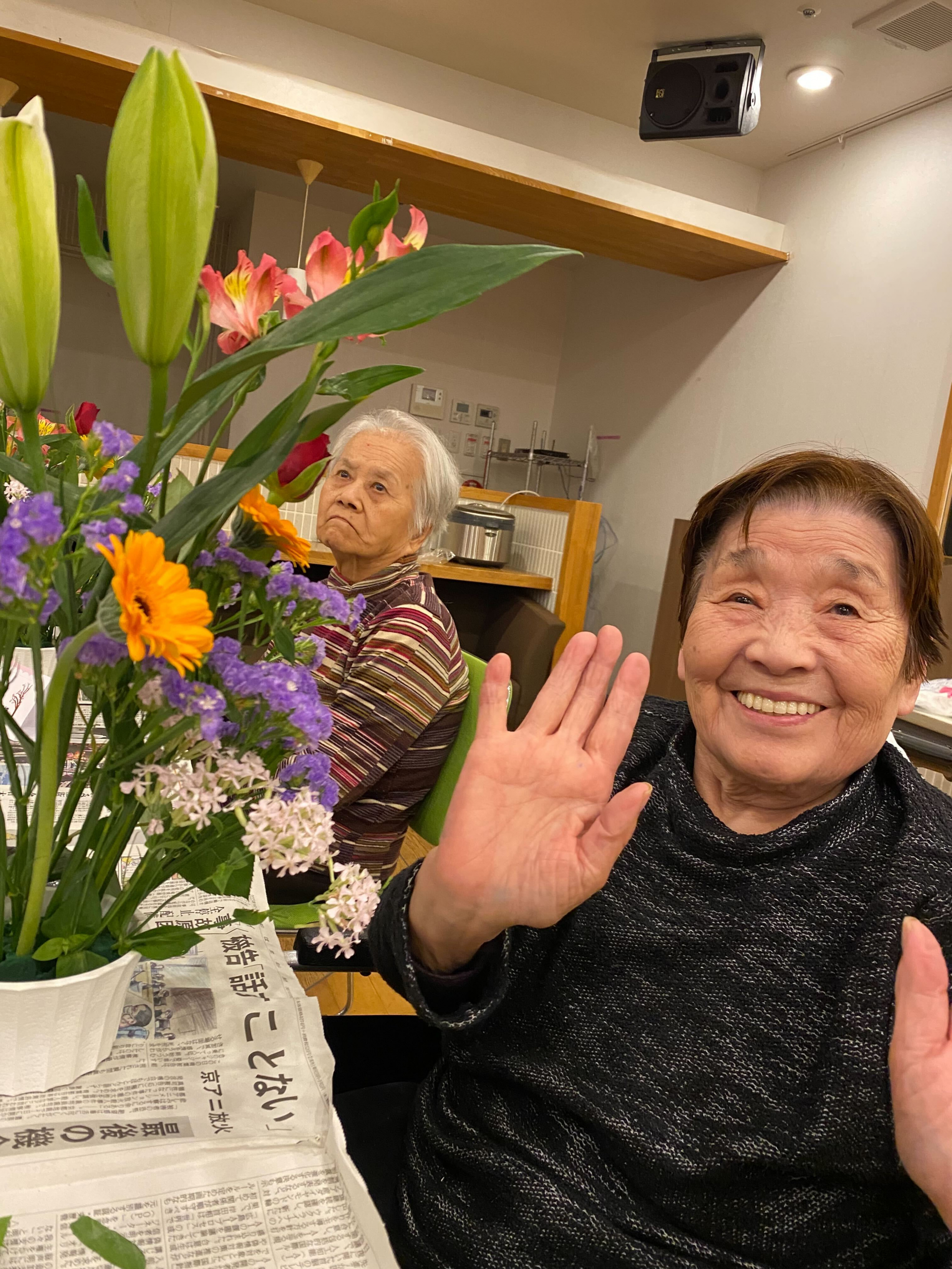 完成したアレンジメントを見て「綺麗。綺麗」「お花は大好きだよ」と嬉しそうに話しました。