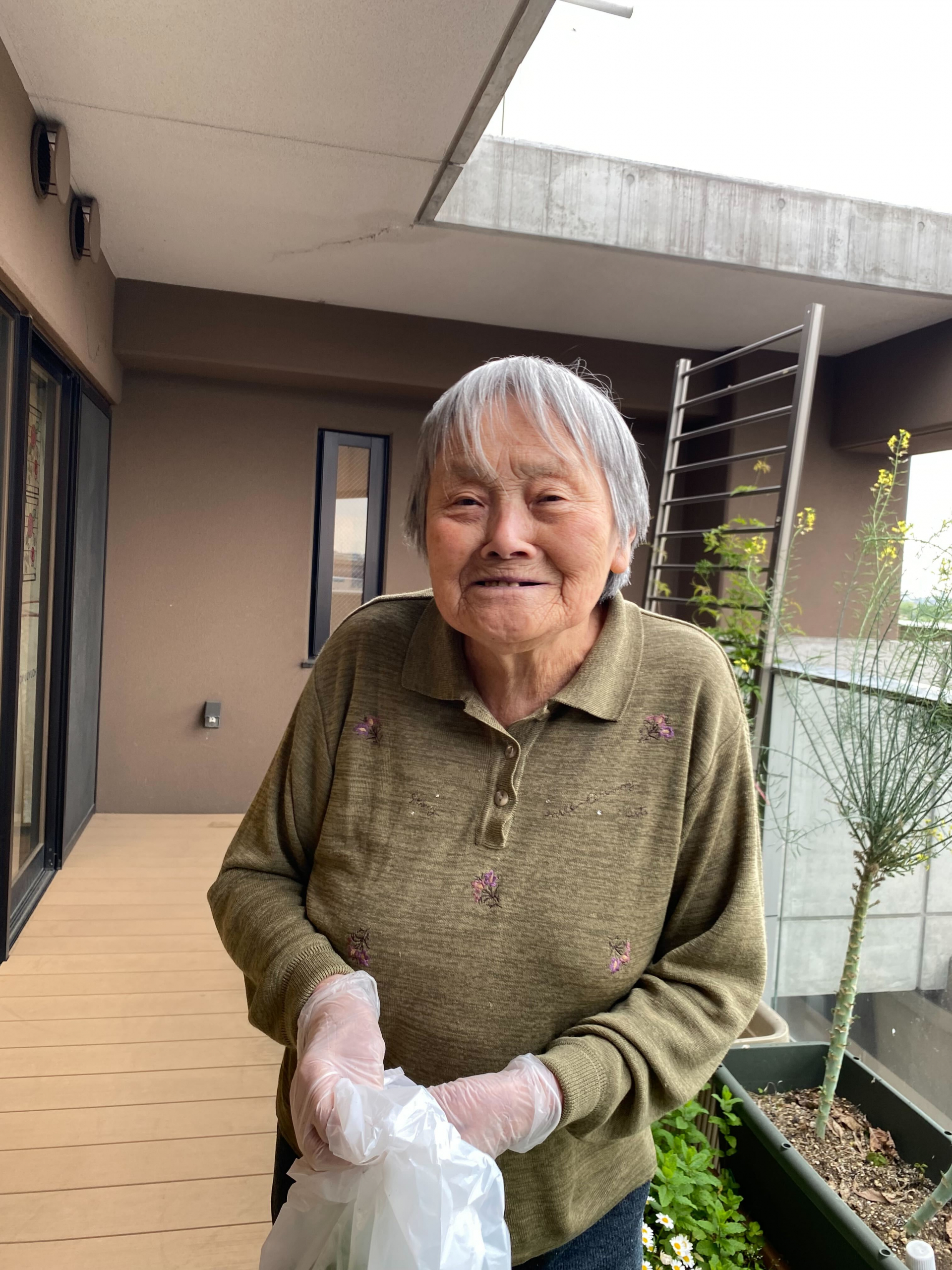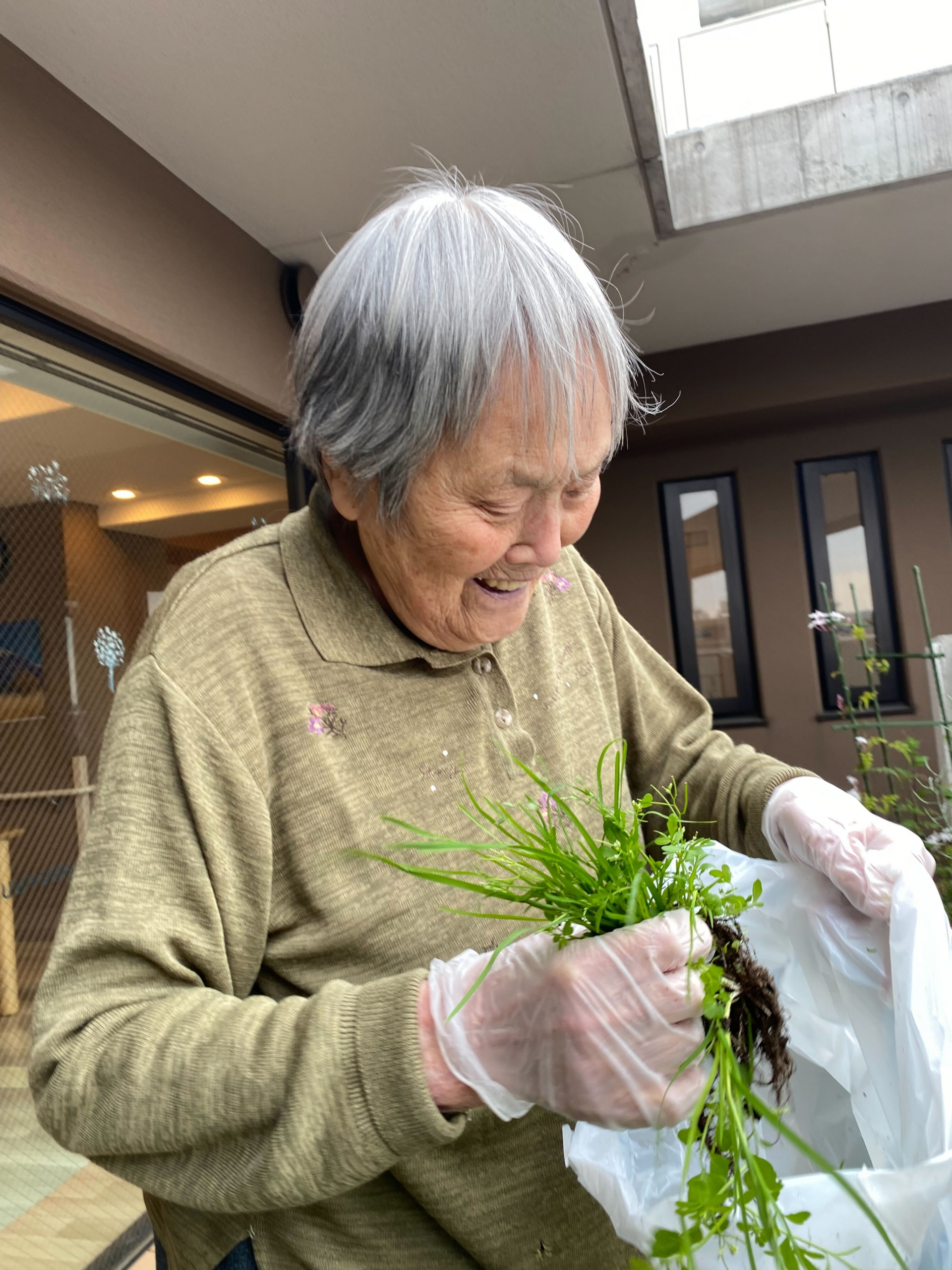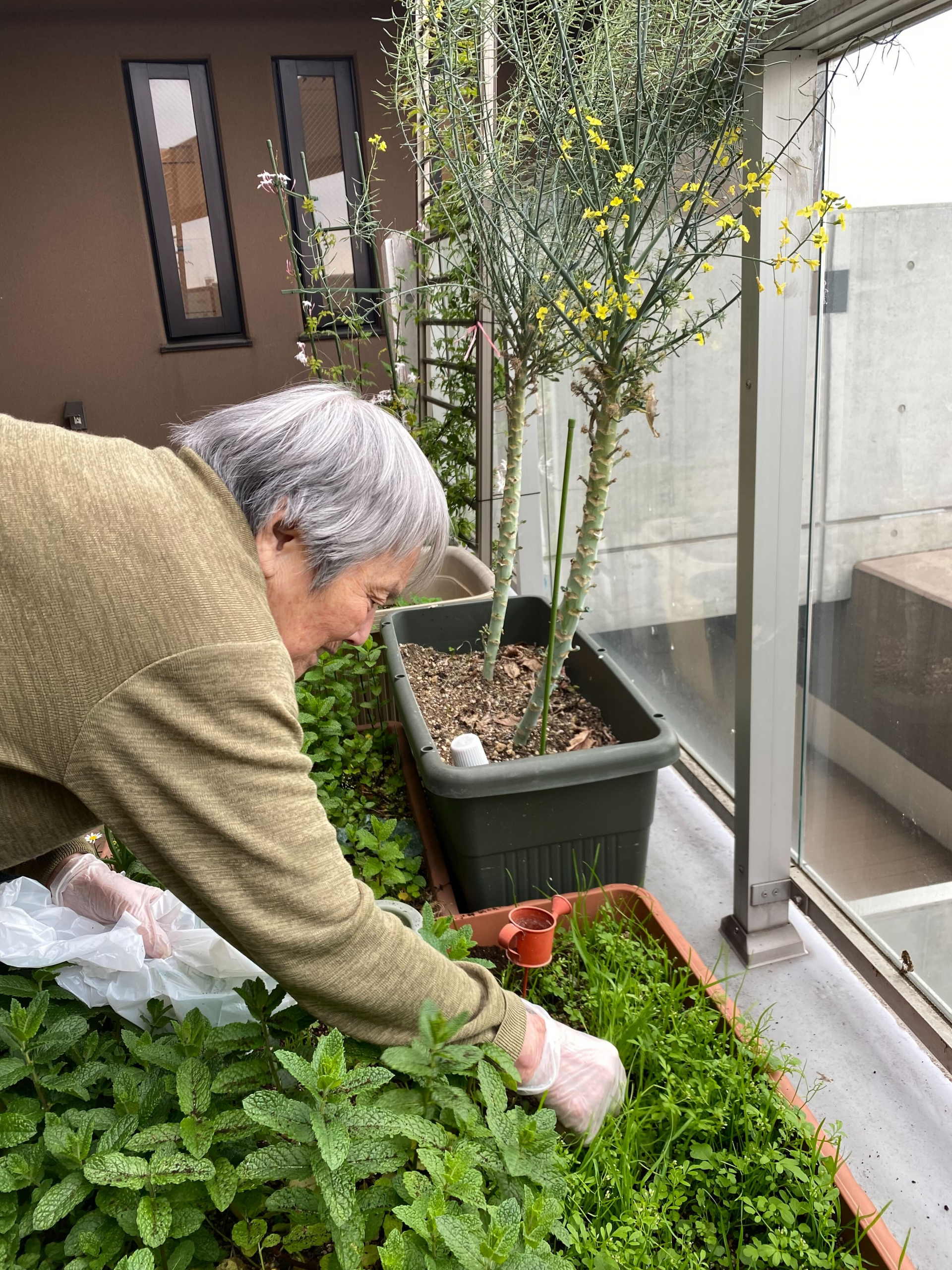 暖かい日差しの中、ベランダで雑草取りを行いました。
