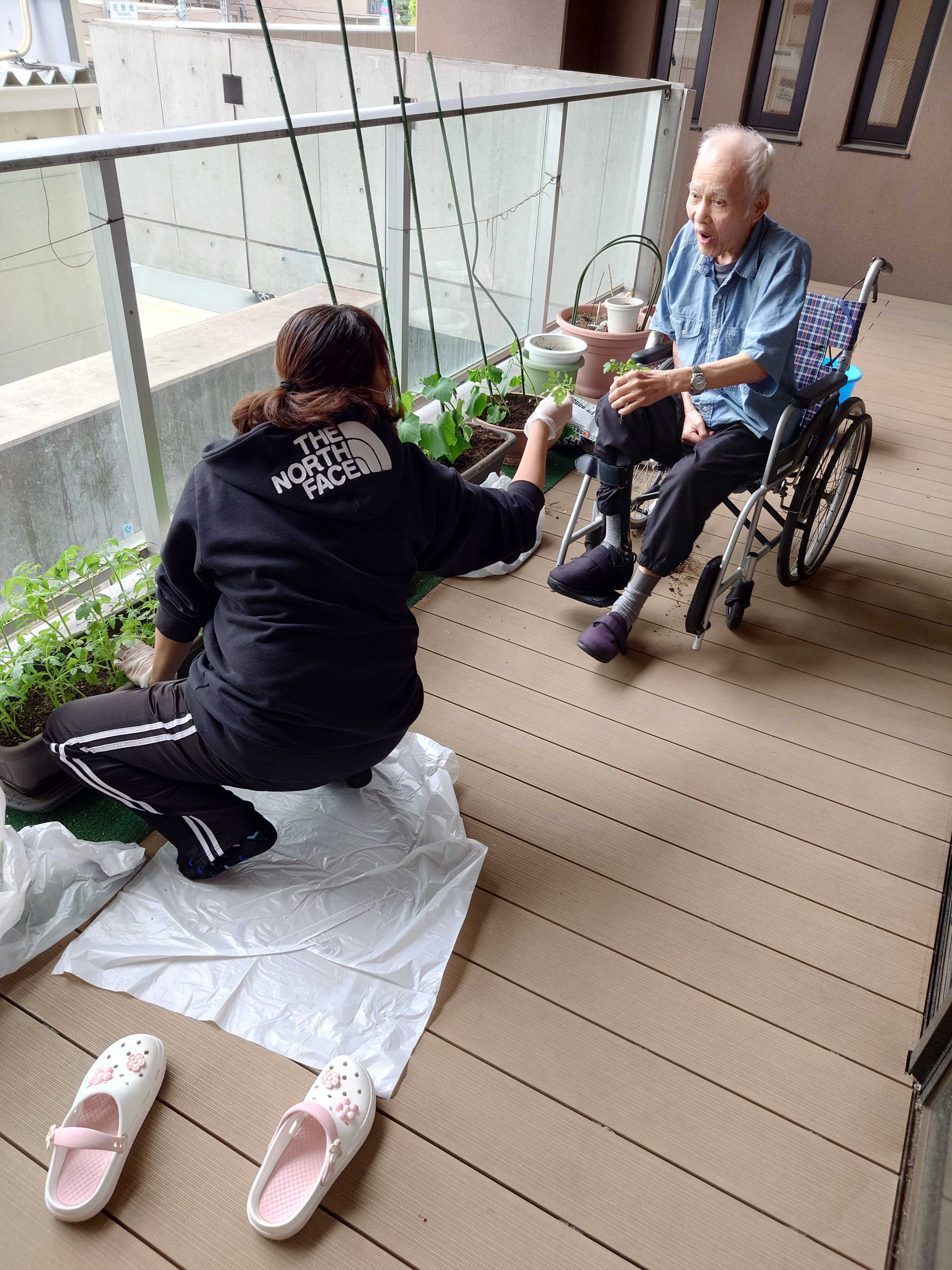 ご利用者様も気になるようで、職員が土いじりしていると興味しんしんに側に・・♪