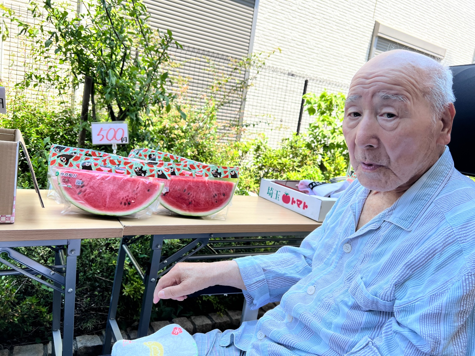 野菜販売イベントに参加し、美味しそうなスイカににっこり。