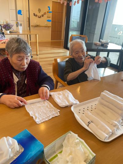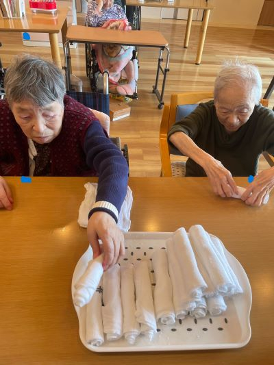 おしぼり畳みを始めると、隣の方にも声をかけて一緒に。