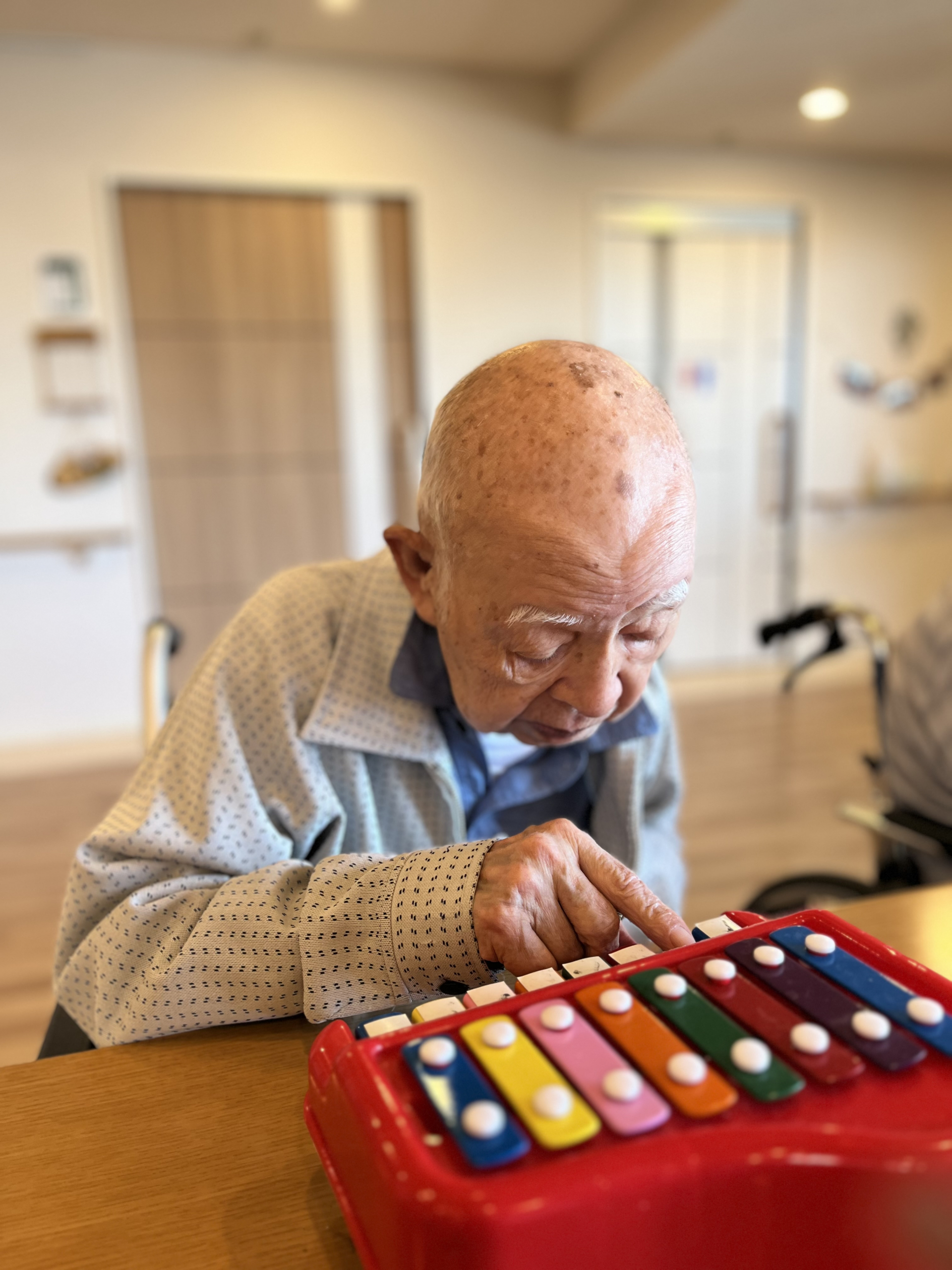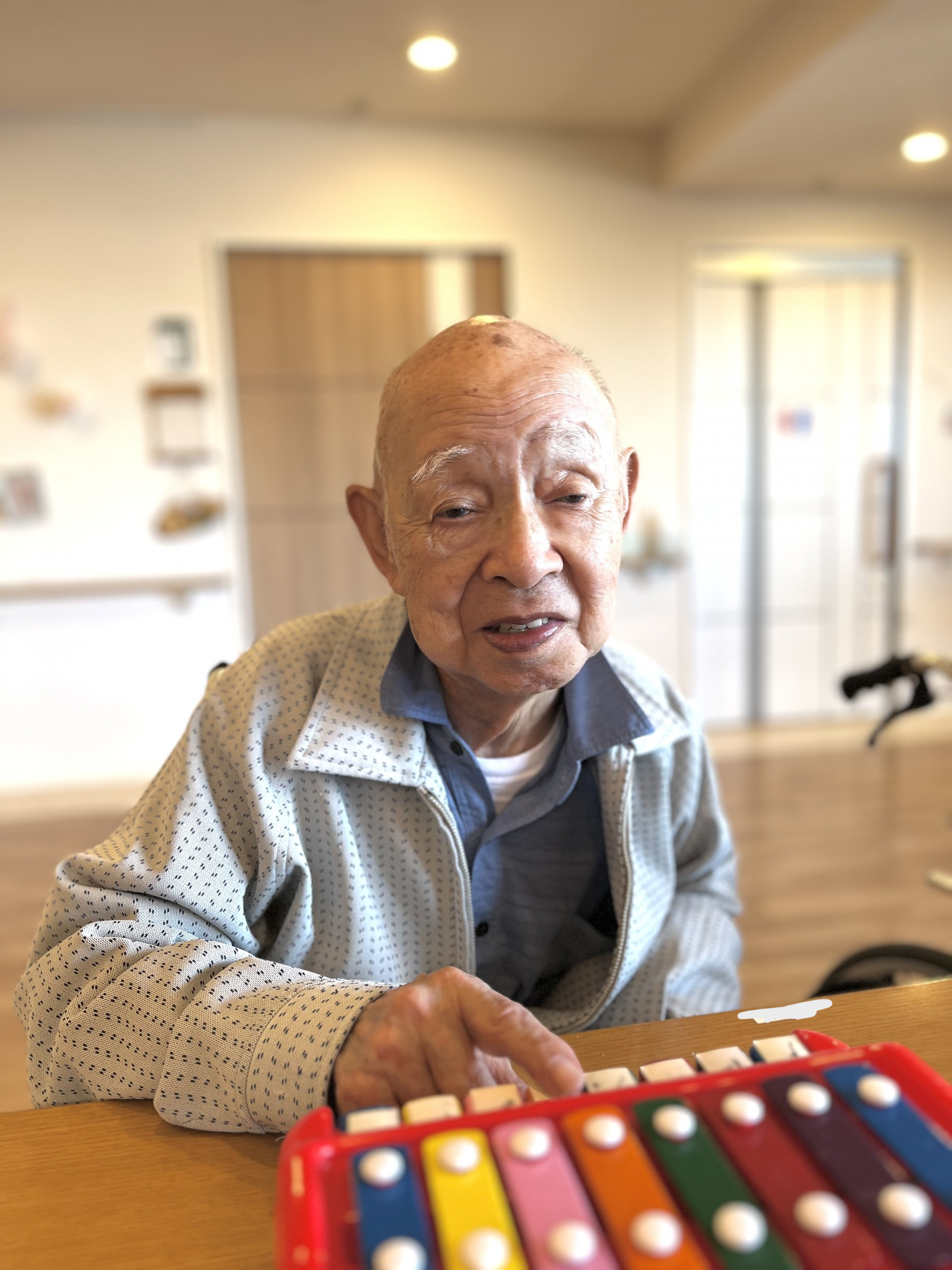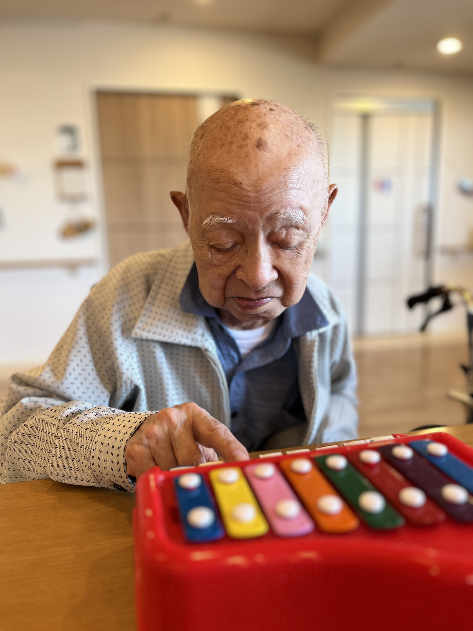 職員が行くと弾きながら職員の方に向いて喜んでいます( ^)o(^ )