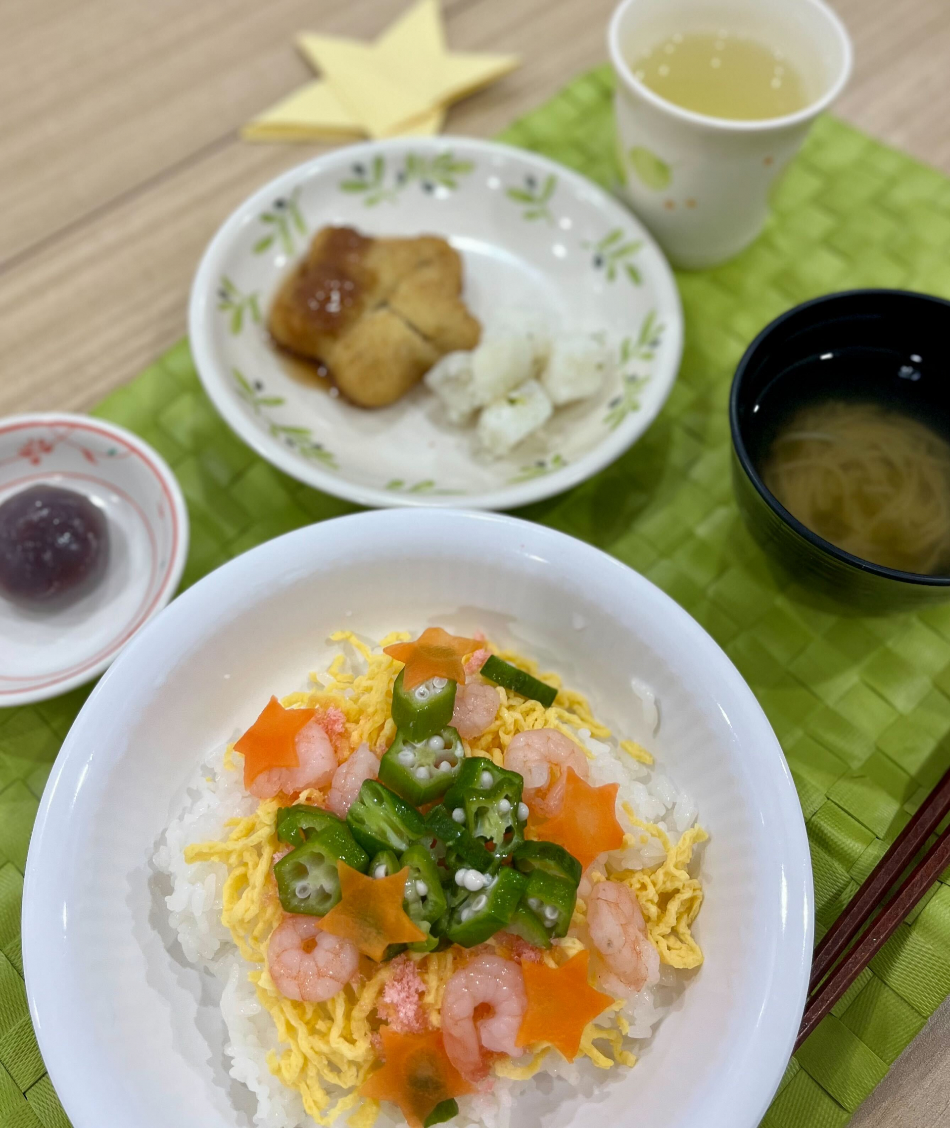 星に型取りされた人参やオクラ、エビ、錦糸卵に桜でんぶ……とてもキュートな見た目に仕上がったちらし寿司はご利用者様にとても大好評でした!