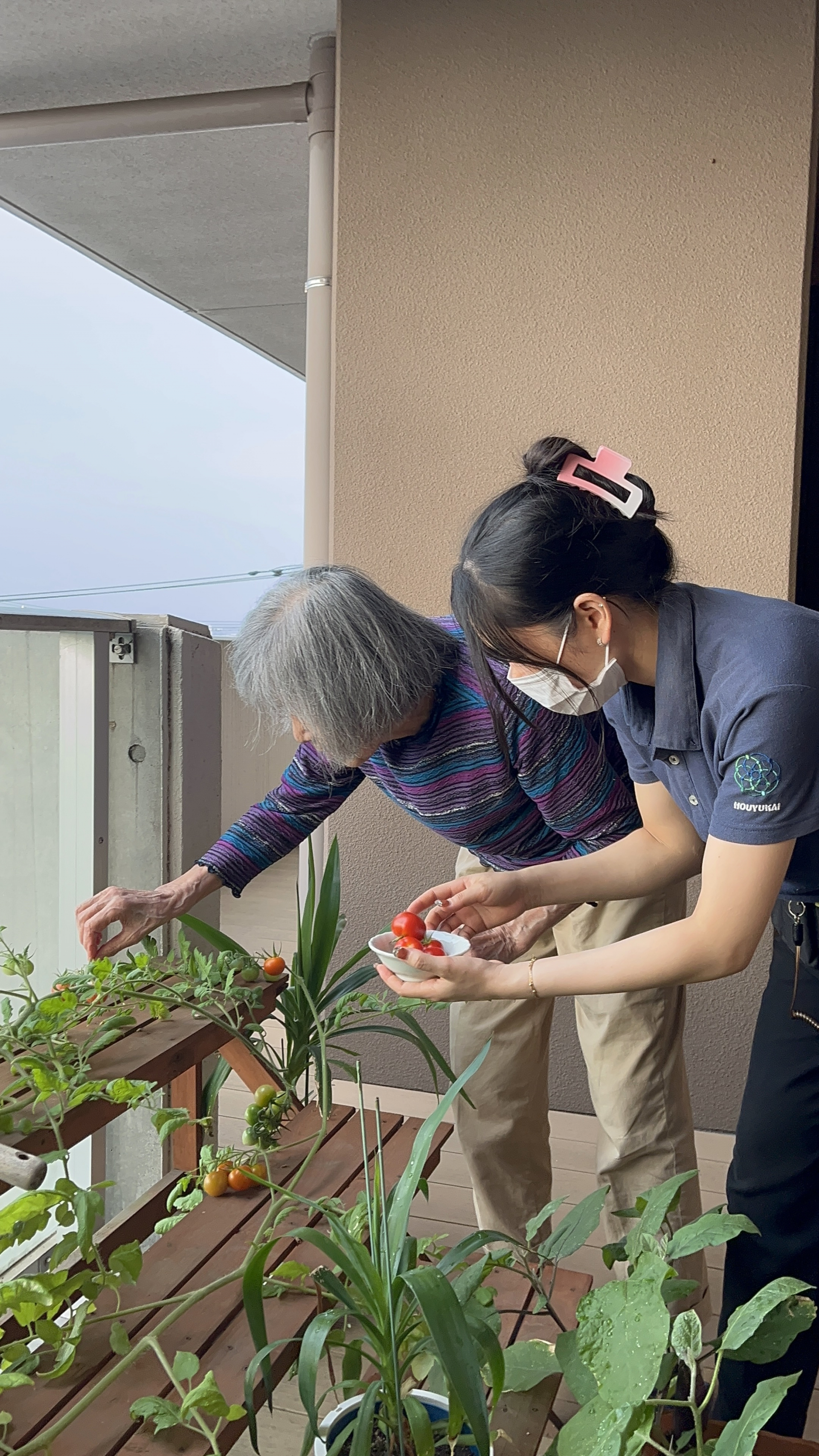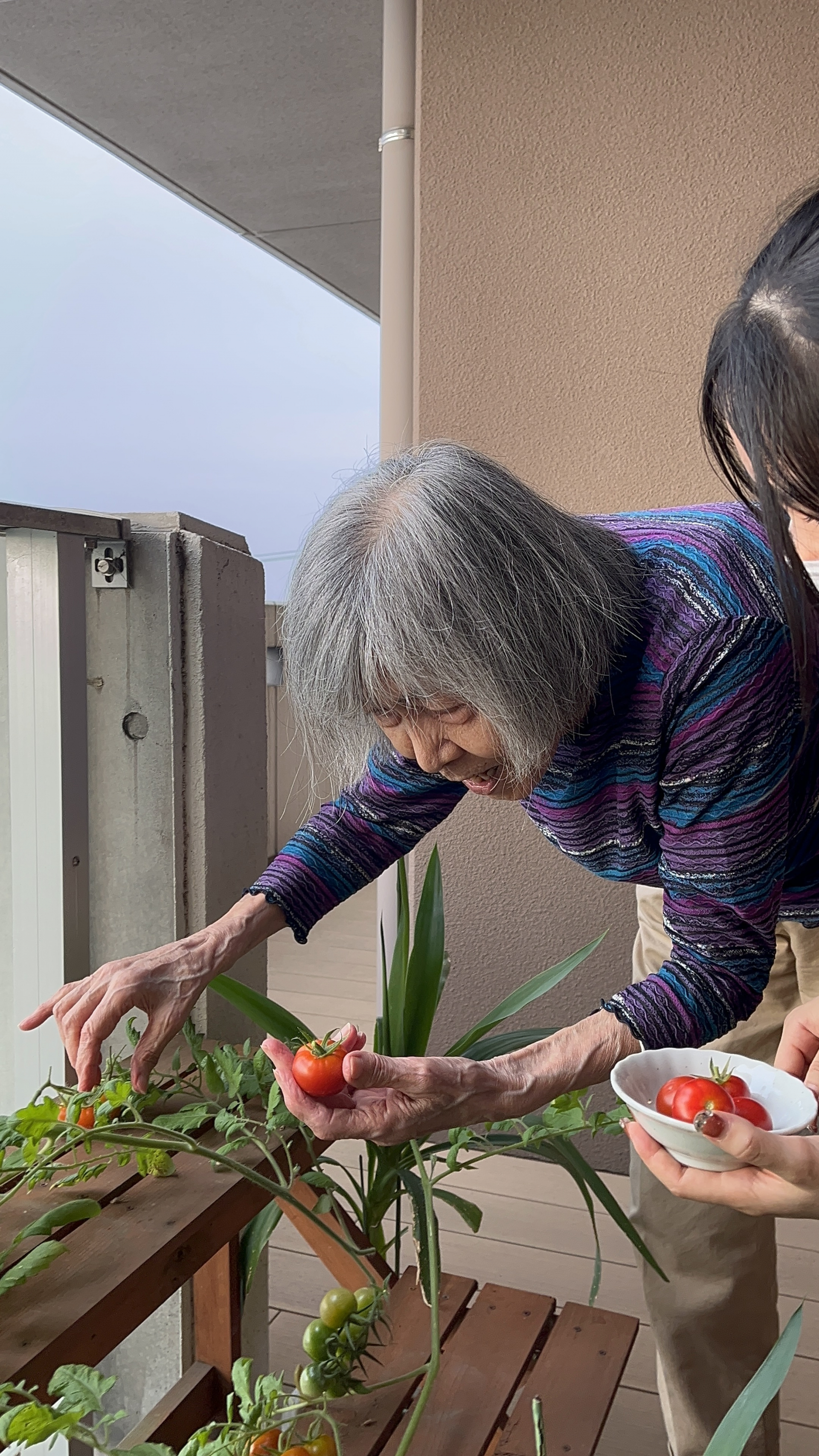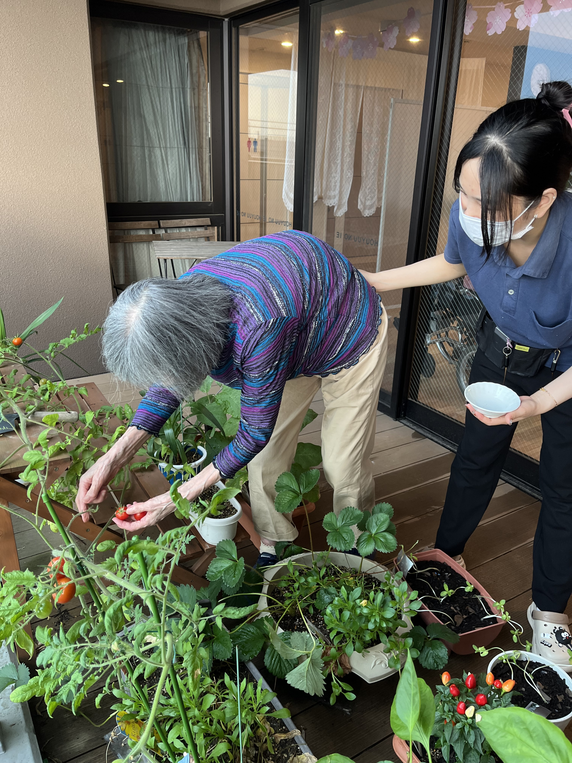 この間ベランダへご利用者様と一緒にミニトマトを収穫に行きました(*´ω`)
