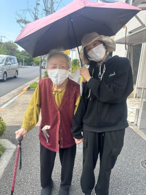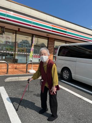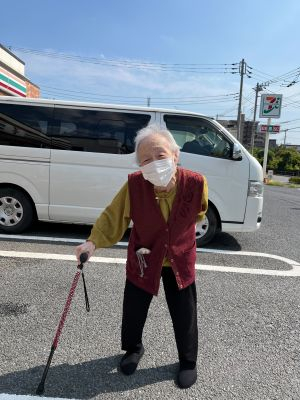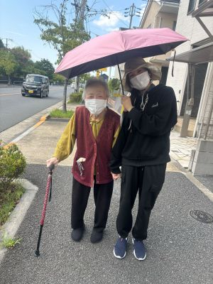 ゆっくり歩きながら外の空気を感じました。それだけではなく、杖を使用し、歩行訓練もできて、よかったですよね。( ^)o(^ )