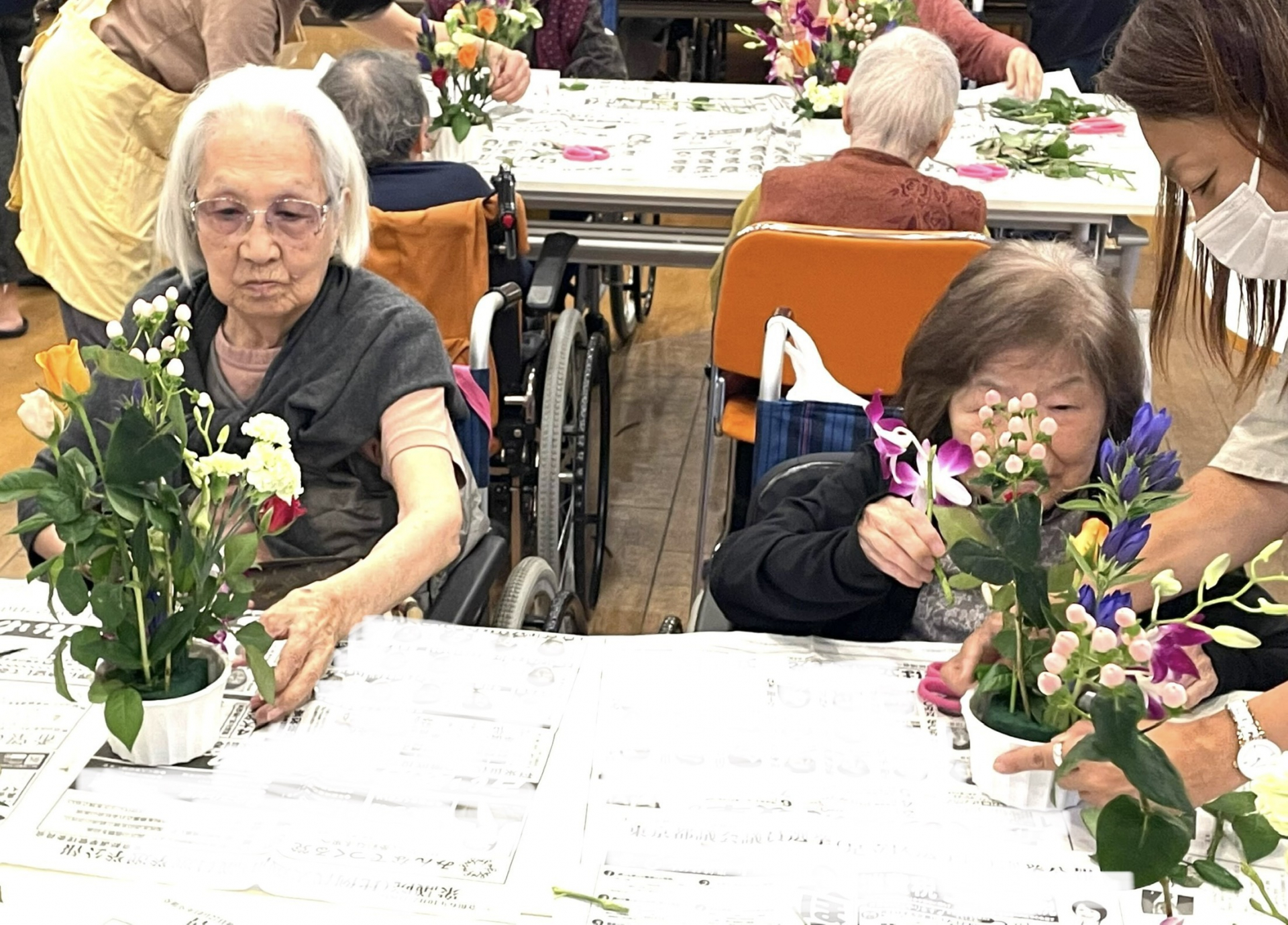 他の階の利用者様やお花の先生とおしゃべりをしながら、