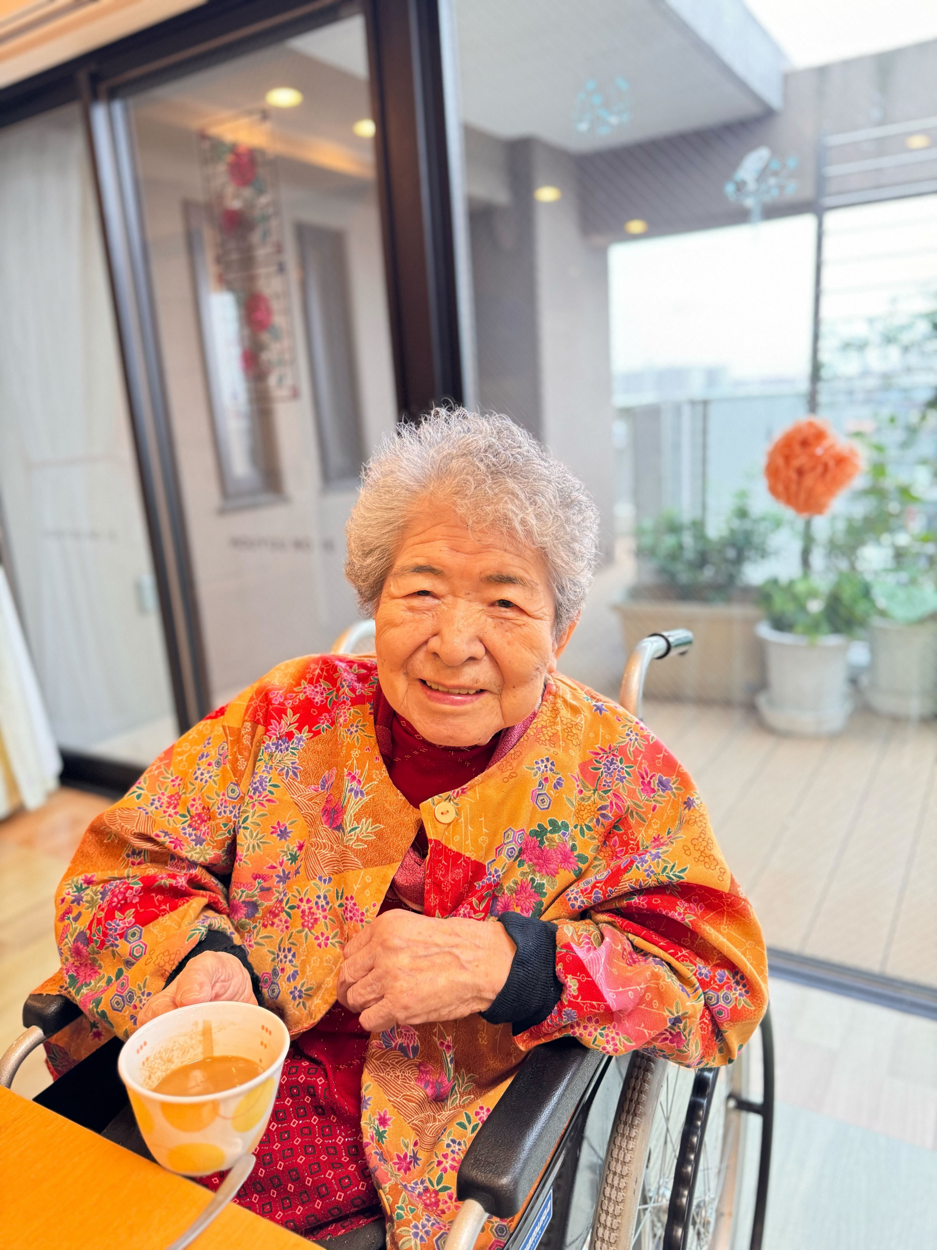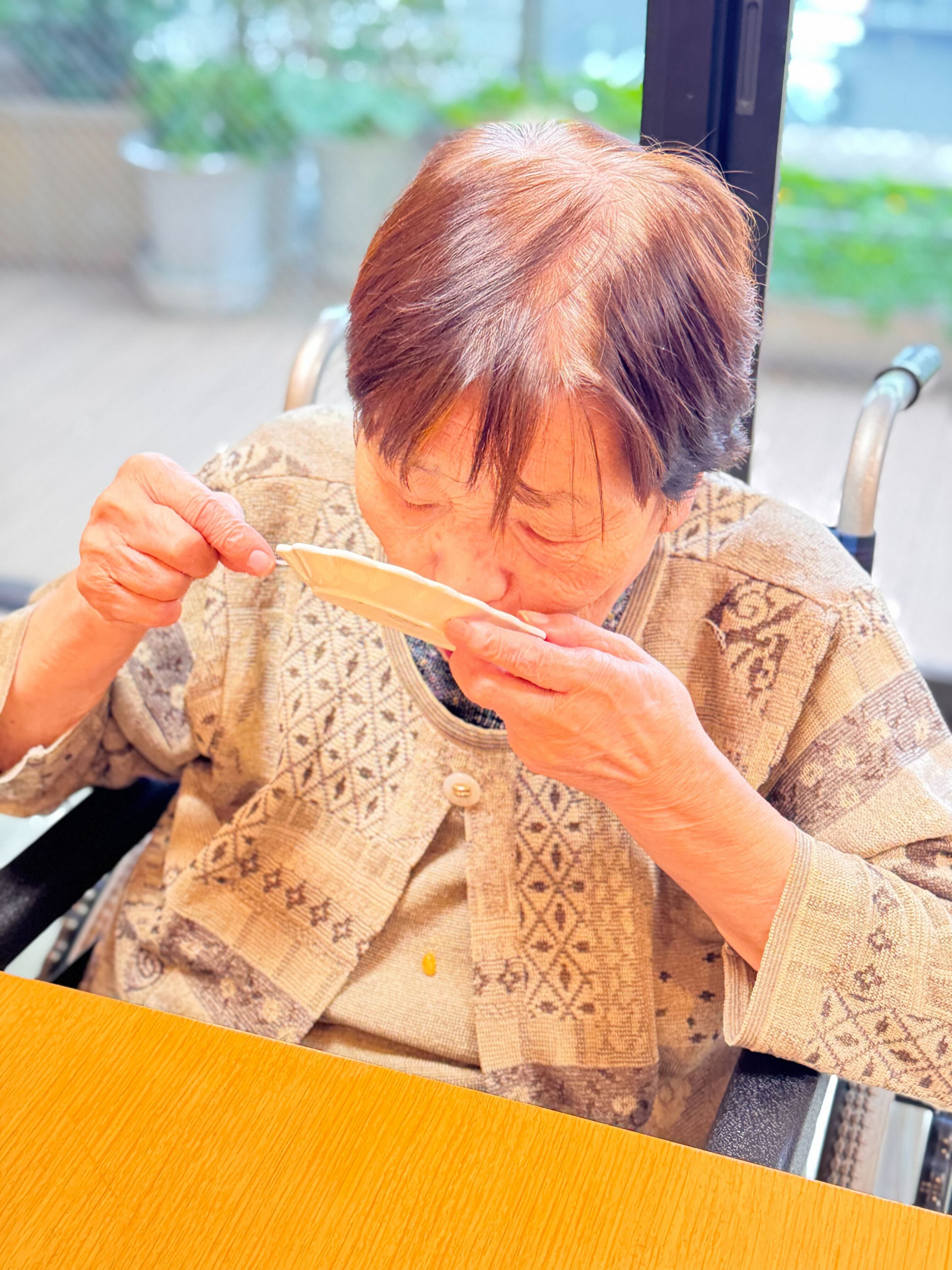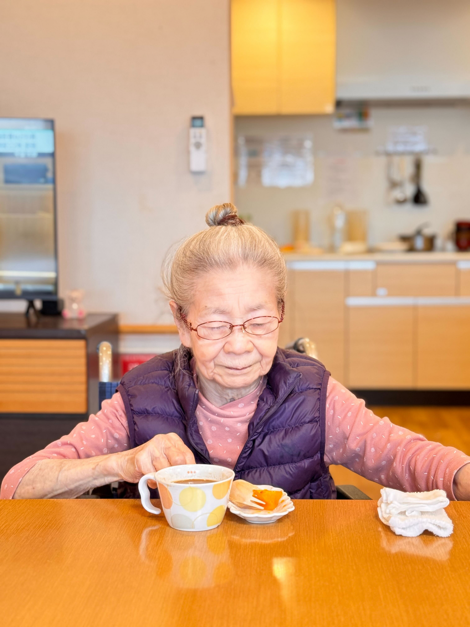 ユニットでは、甘くてとろける柿と温かい飲み物を囲んで、ほっと一息。あっという間に全部召し上がりました。「おいしいね」「昔よく食べたね」と笑顔が広がり、会話も弾みました。秋の味覚を楽しみながら、皆さんの表情もとても柔らかく、心までぽかぽかに。季節を感じる、あたたかな午後のひとときとなりました。