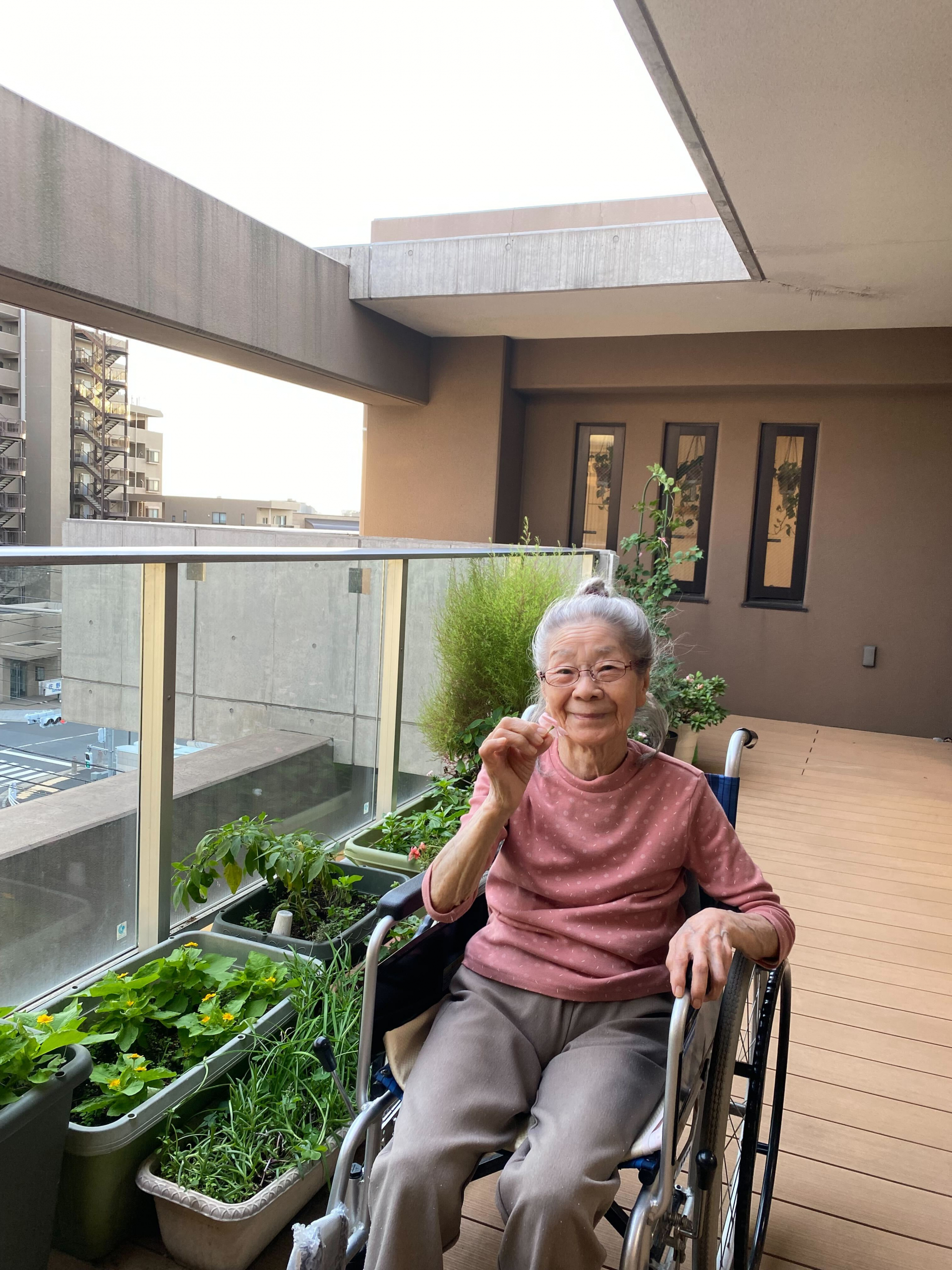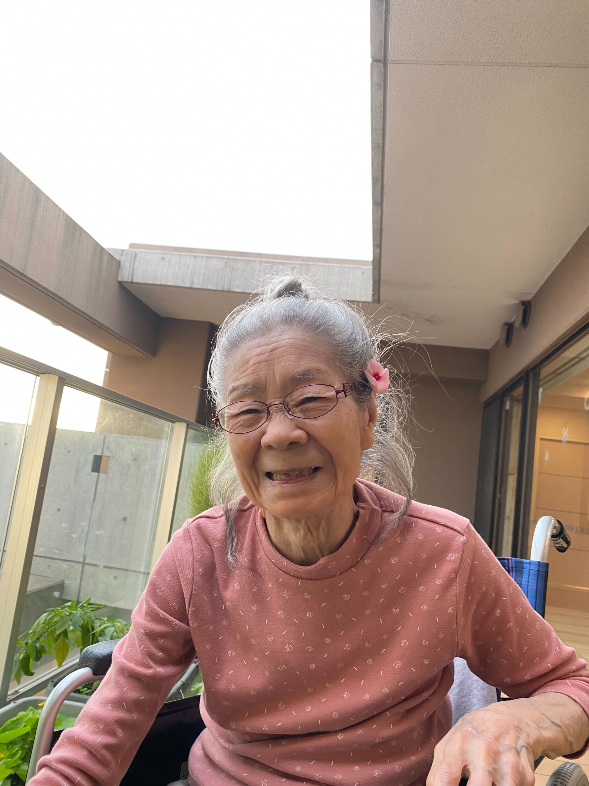 花のお世話を終えたあとは、にっこり笑顔。その笑顔は、まるで沈む夕陽のように、あたたかくてやさしい。