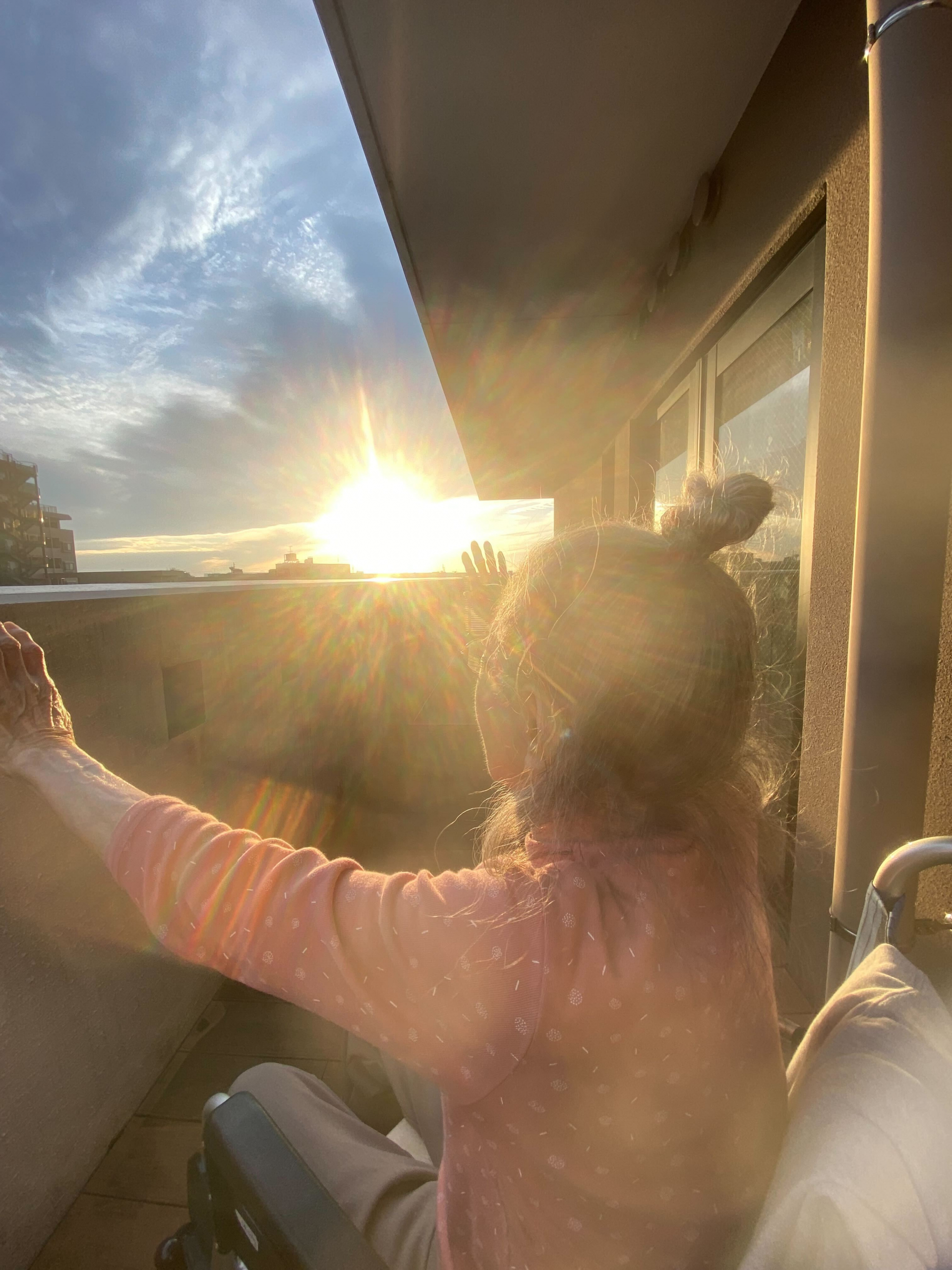 一日の終わり、夕陽が優しく差し込むベランダで。オレンジ色に染まる空を眺めながら、静かな時間が流れます。