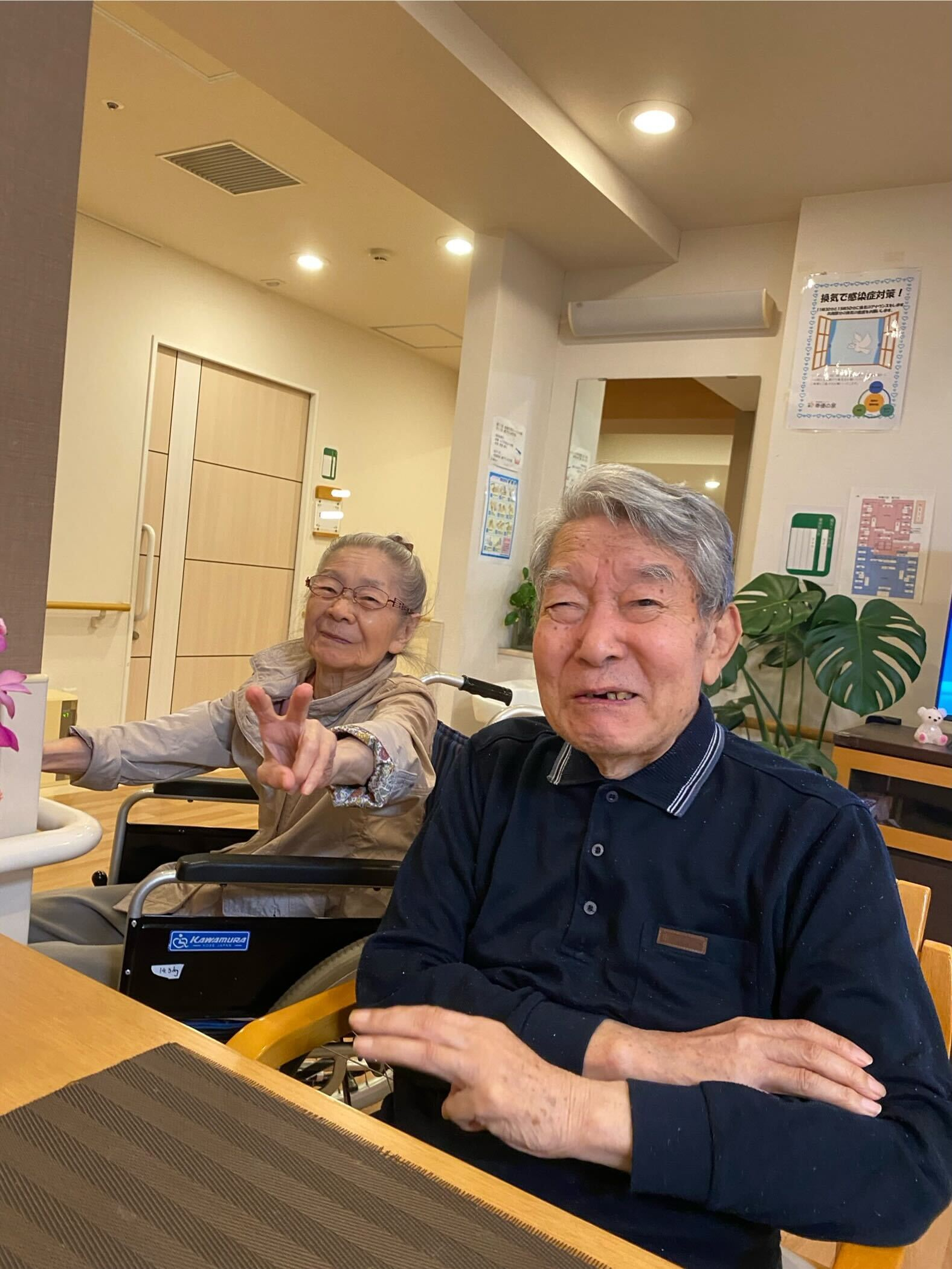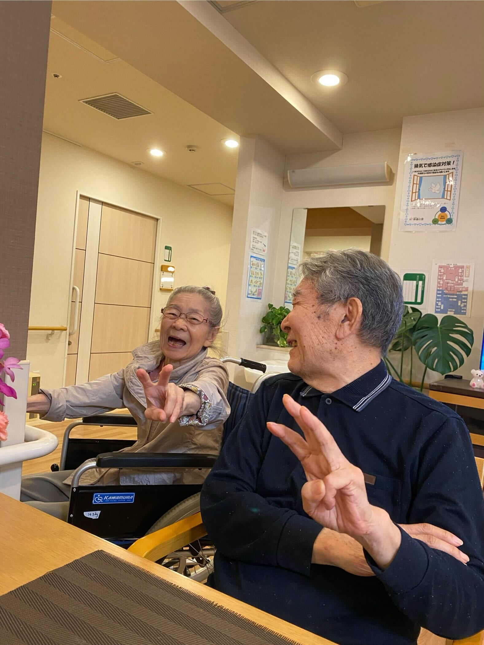 ピースサインで記念撮影会話も弾み、表情もとても生き生きとしていらっしゃいました。こうした何気ないひとときが、毎日の大切な喜びの一つです