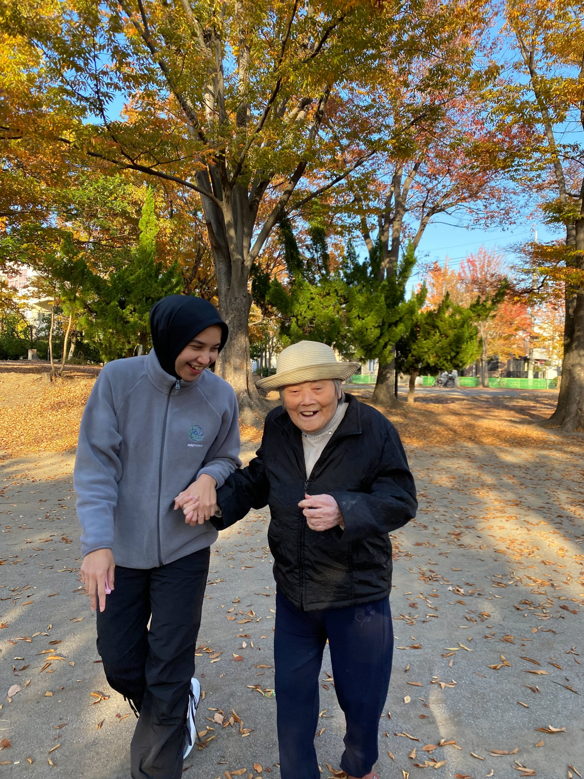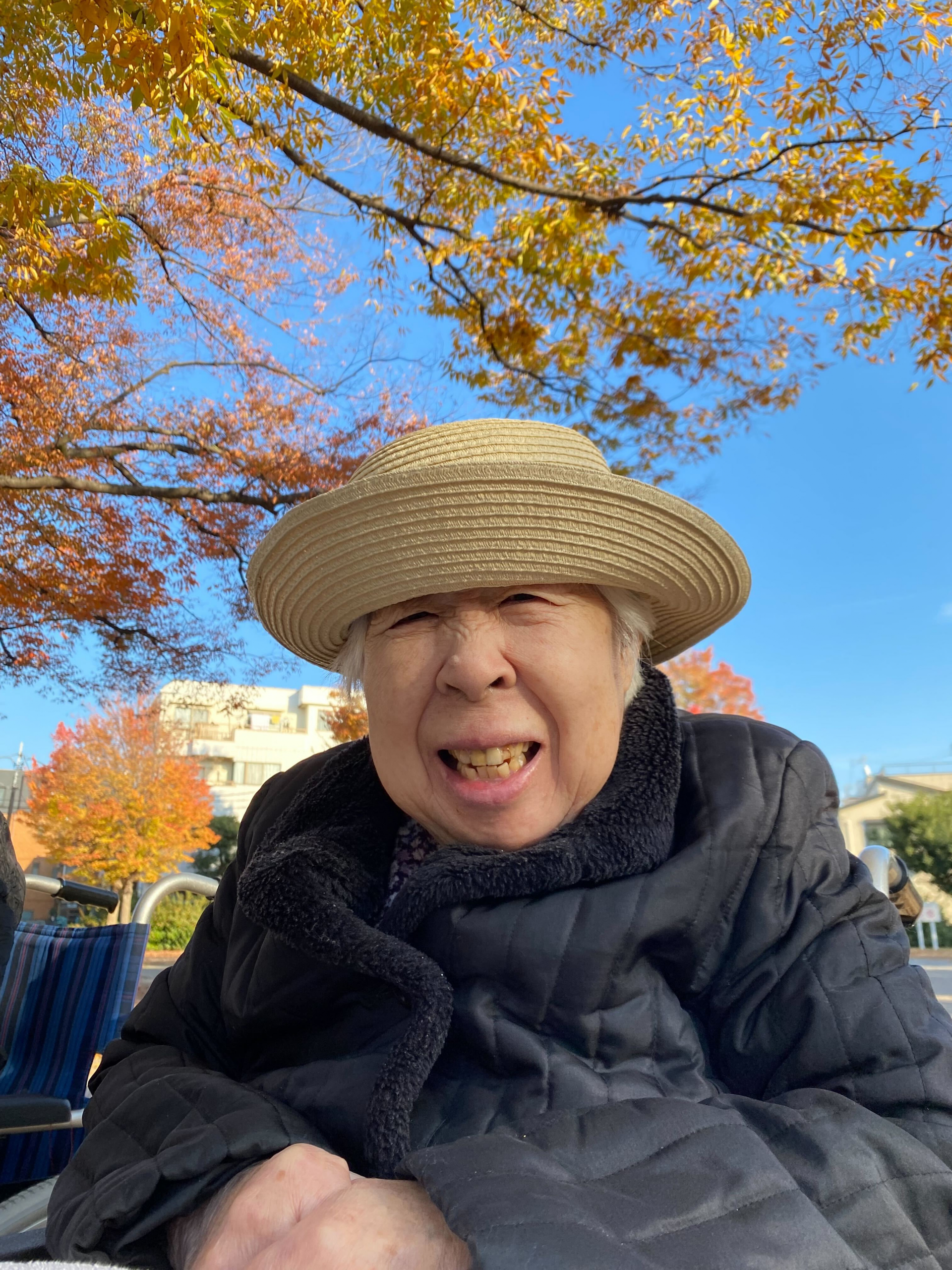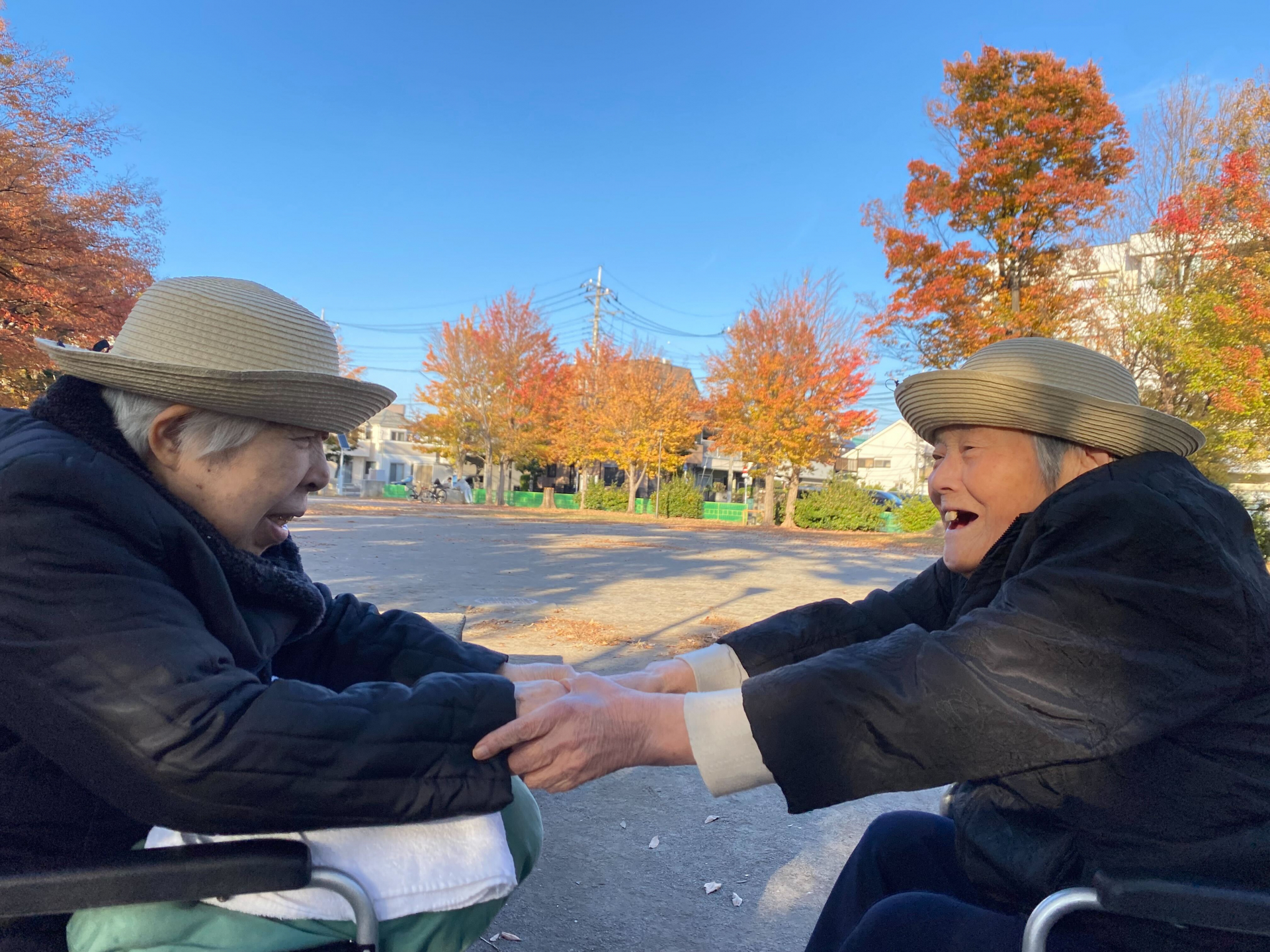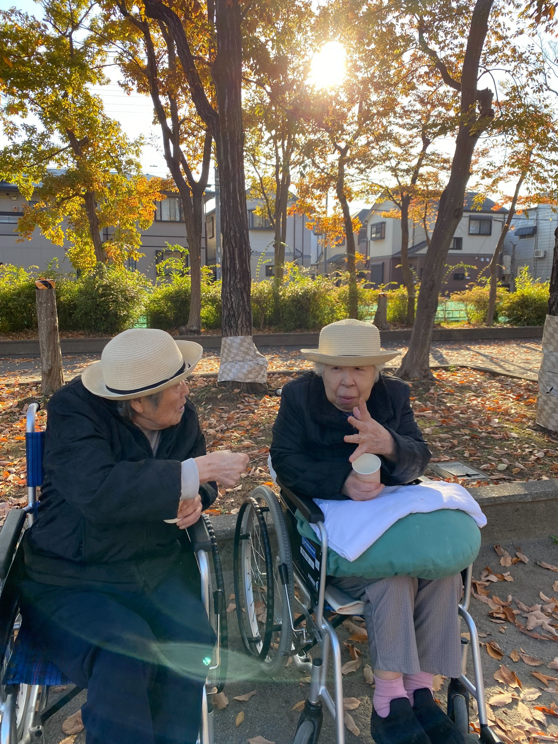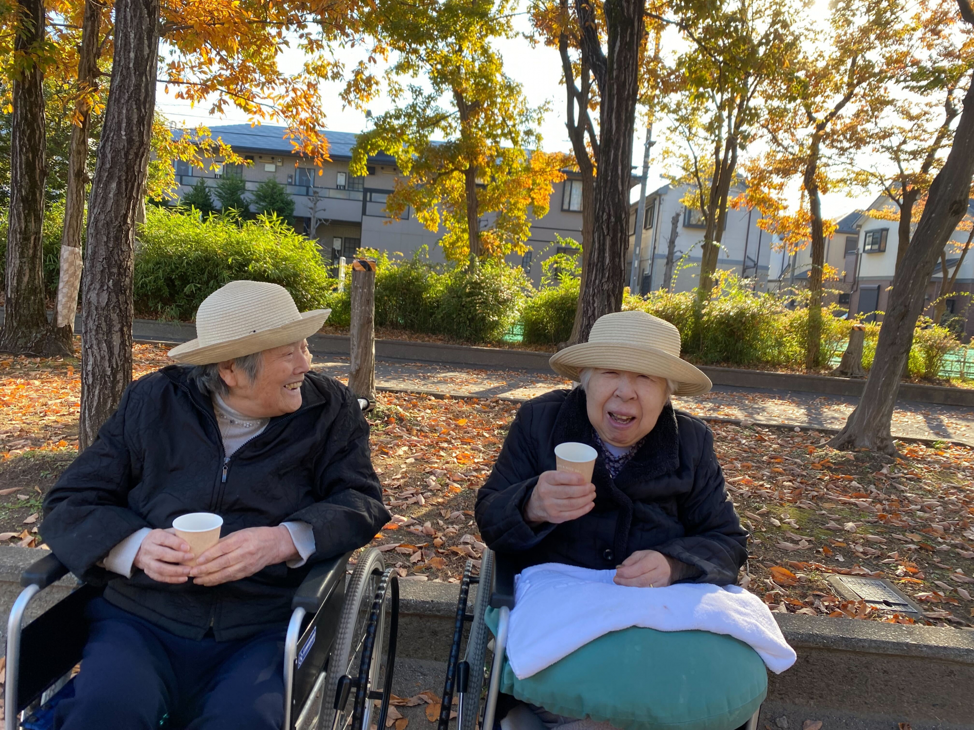 澄んだ秋空のもと、近くの公園へお出かけしました。色づく紅葉に囲まれながら、車椅子を並べておしゃべりしたり、あたたかい飲み物を片手に笑い合う時間は、自然と心がほぐれるひとときです