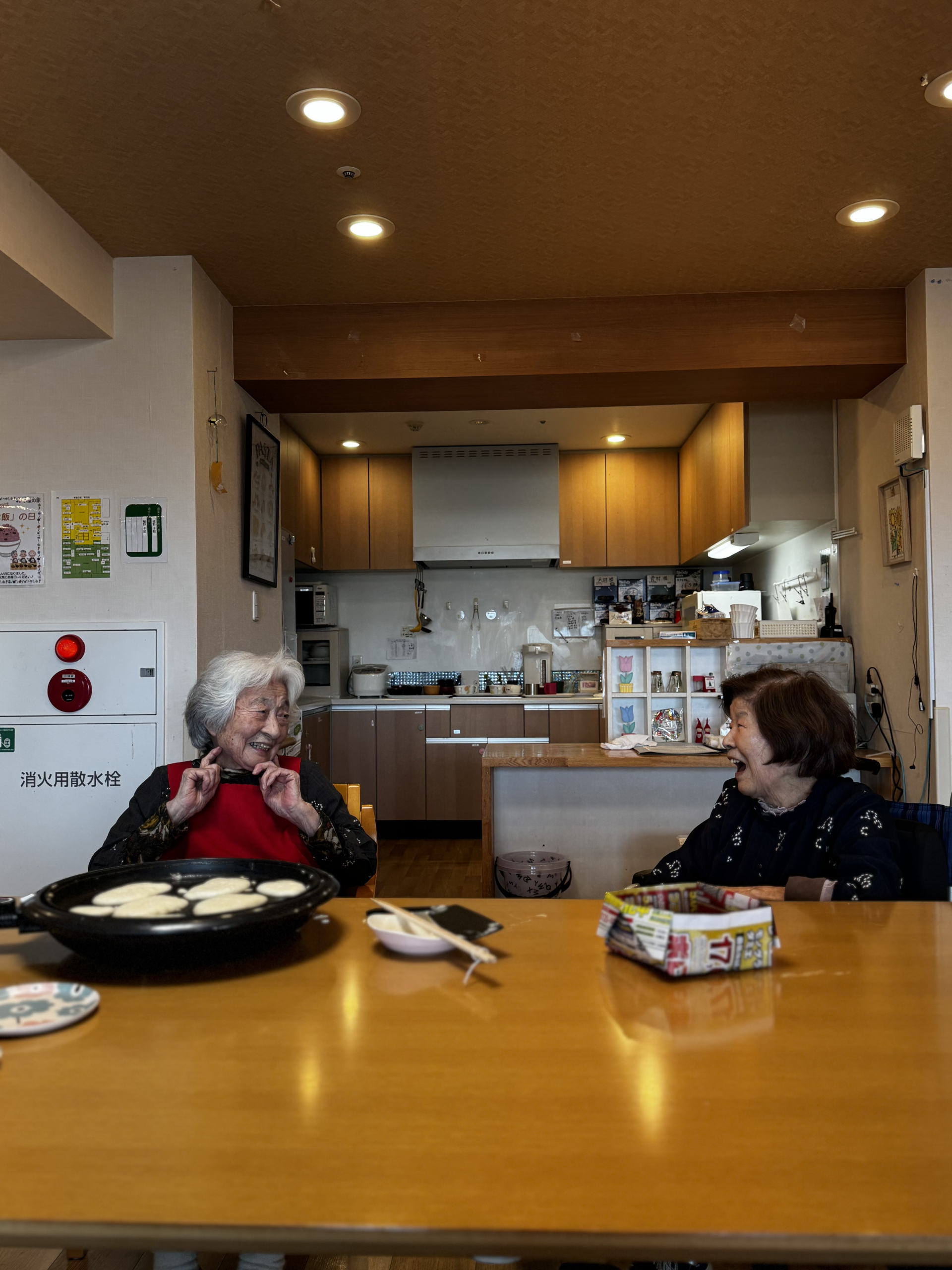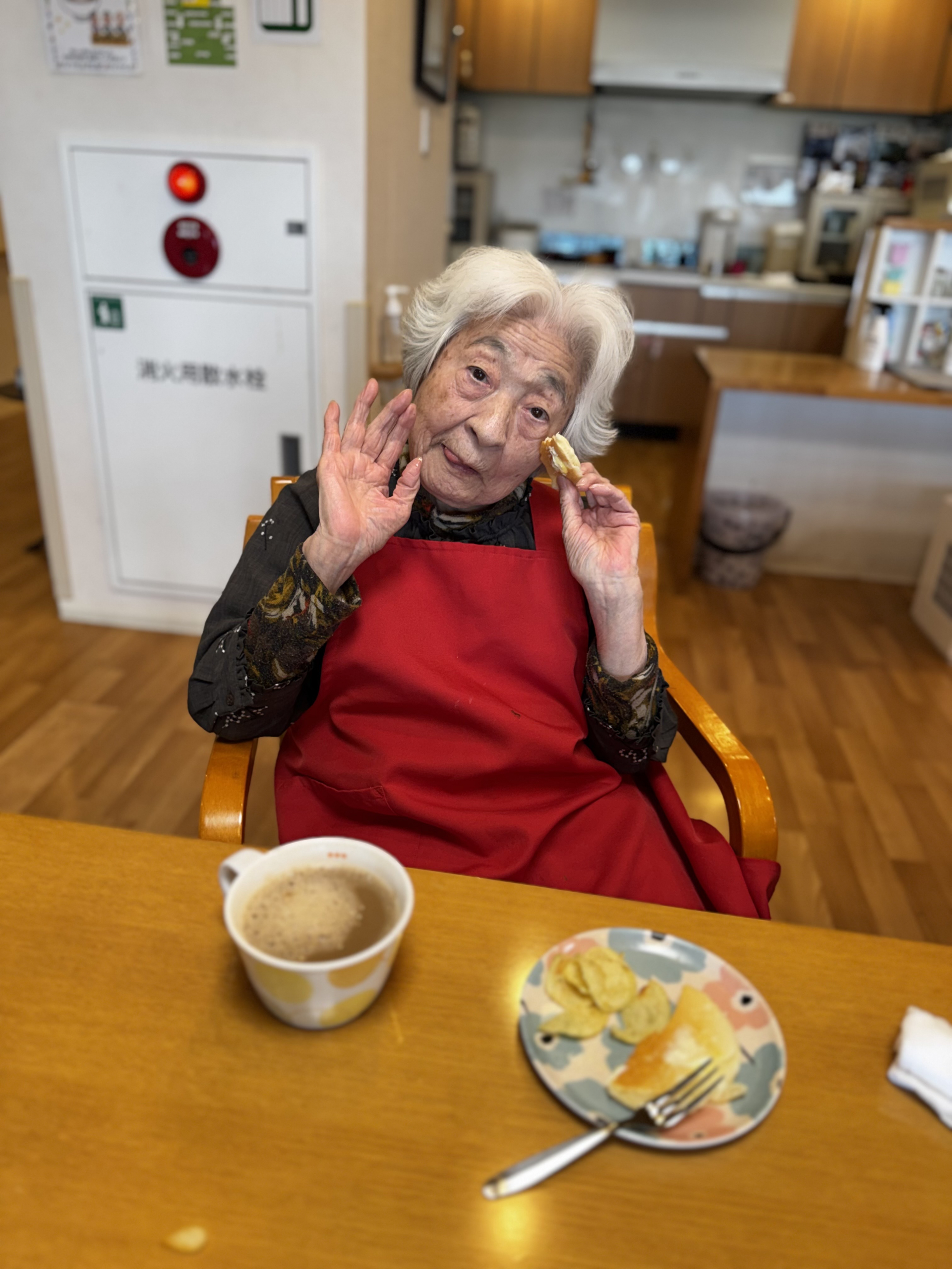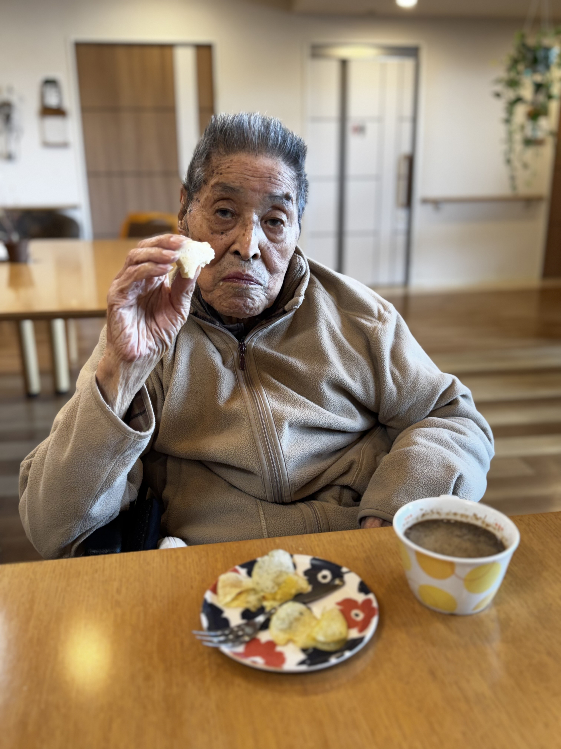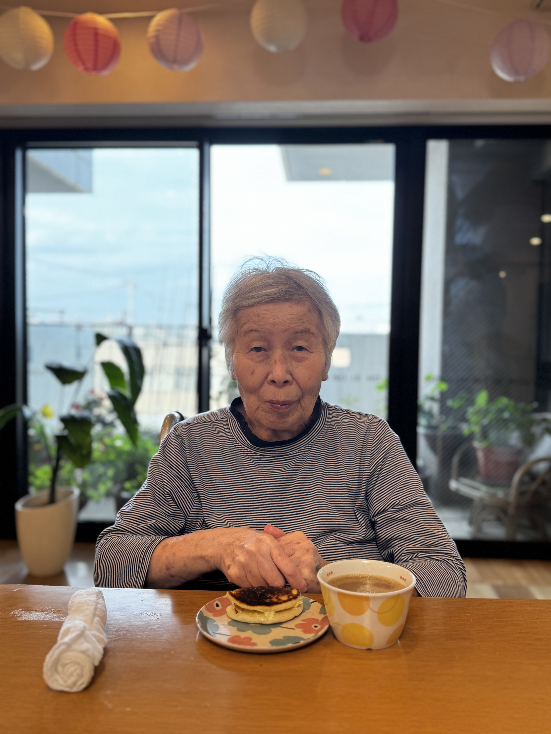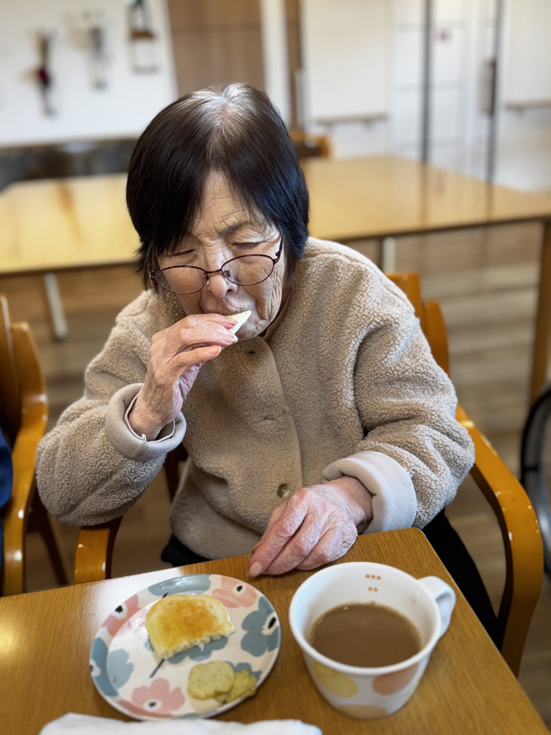 本日のおやつ時間に皆様がプロアでお話したりホットケーキをお召し上がり、