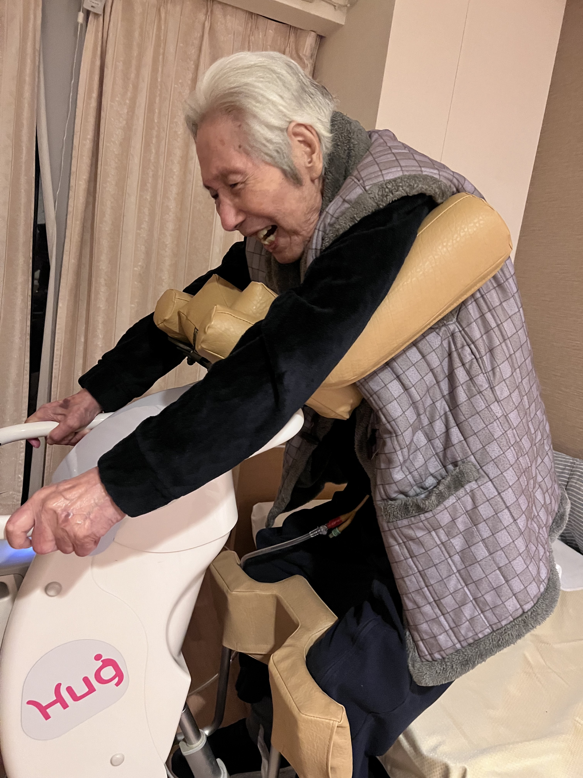 専用の立位支援機器(Hug)を使って、利用者様がゆっくりと立つ練習を行いました。