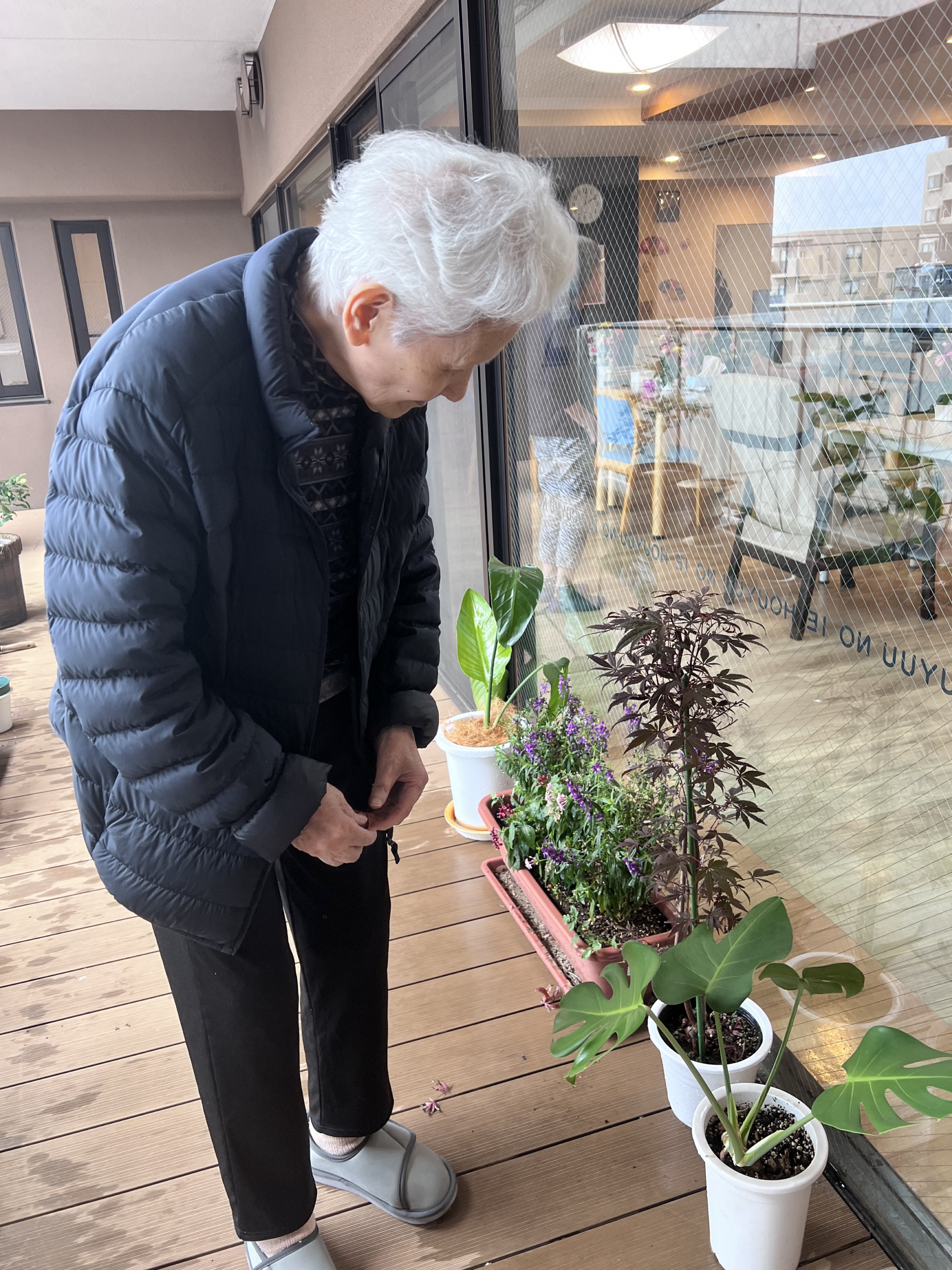 本日は、利用者様と一緒にバルコニーの菜園を見に行きました。