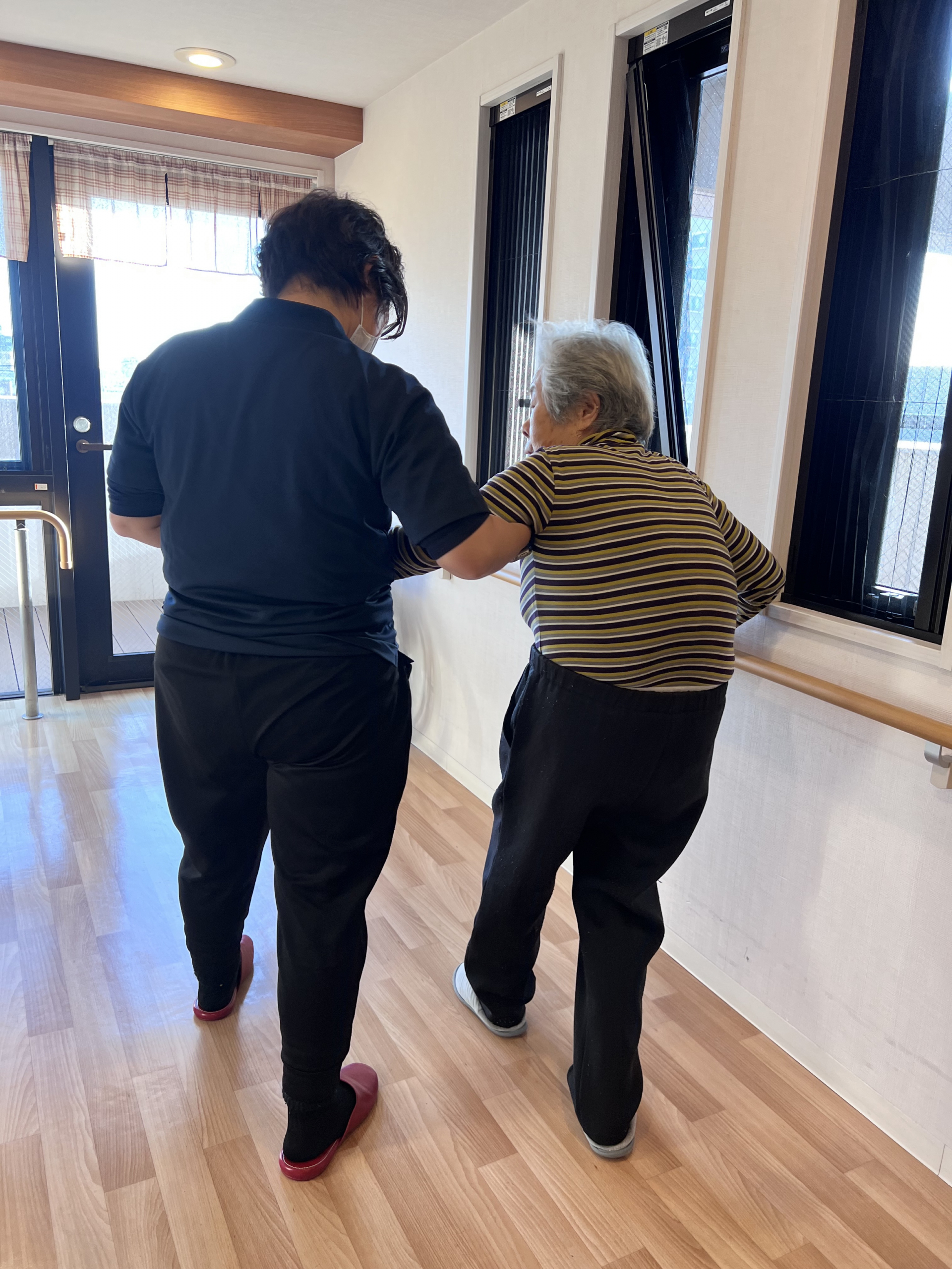 マッサージ後に、職員付き添いのもと歩行訓練を行いました。