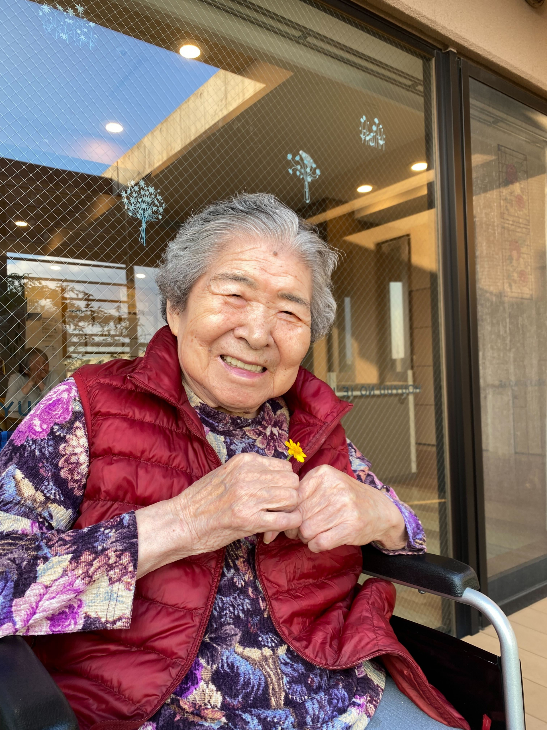 お天気の良い午後、ベランダで小さな黄色いお花を手に、素敵な笑顔を見せてくださいました。花と同じくらい明るい笑顔に、周りも思わずにっこり
