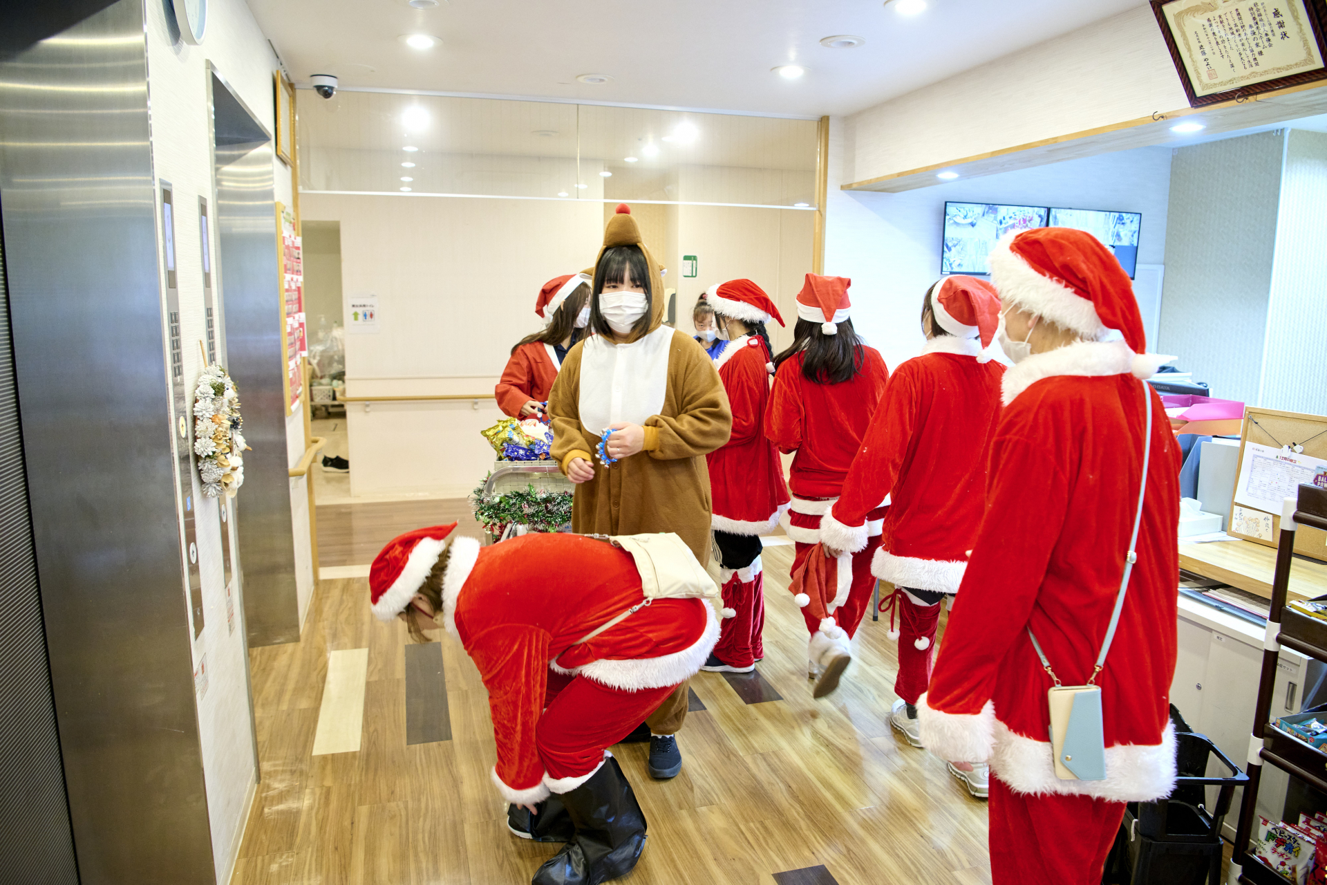 準備ができたら大勢の職員サンタが、各ユニットにケーキを届けに♬ もちろんトナカイを連れて、、
