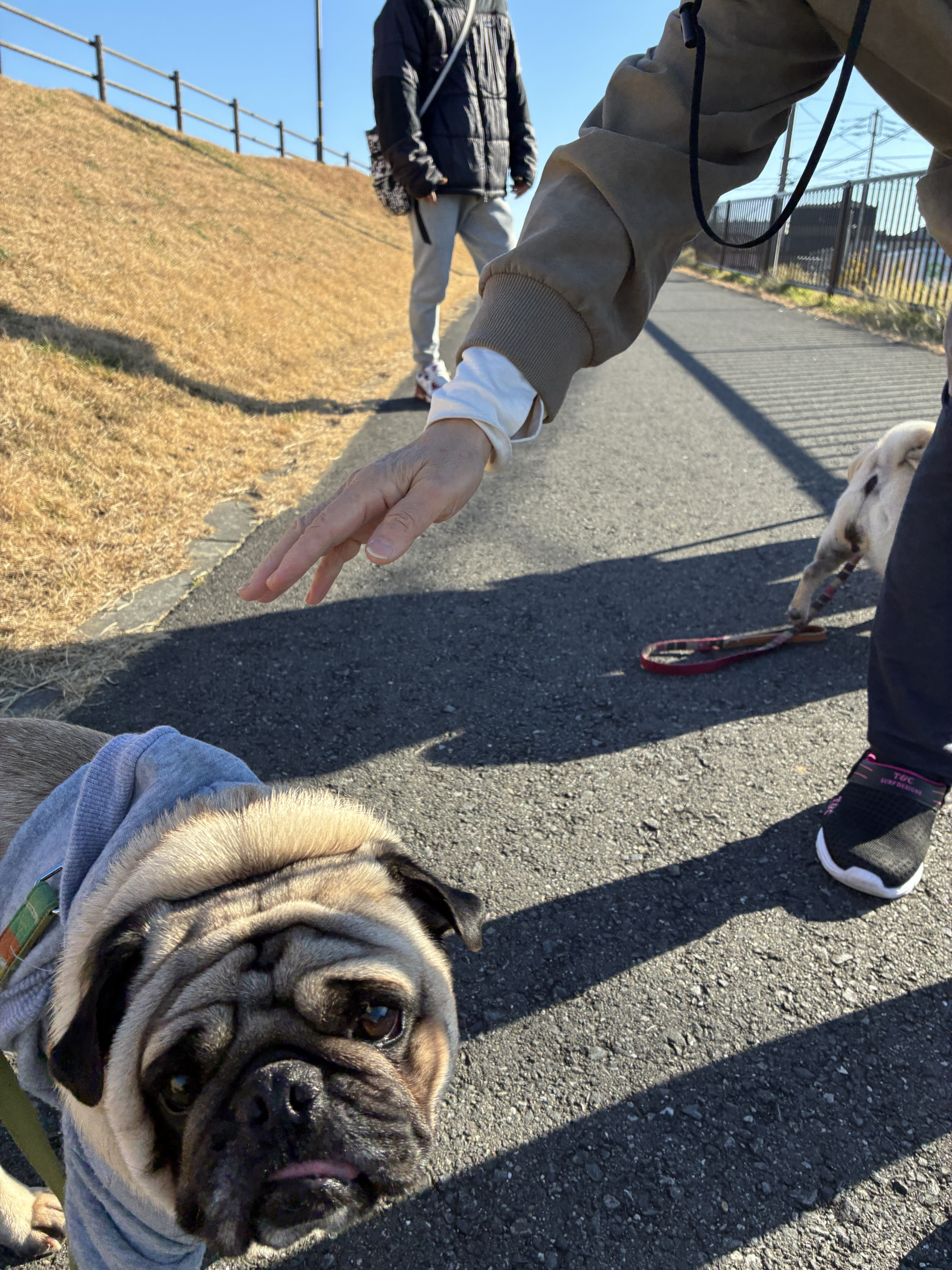 帰りは土手を散歩し、途中で出会ったワンちゃんと触れ合う場面もあり、