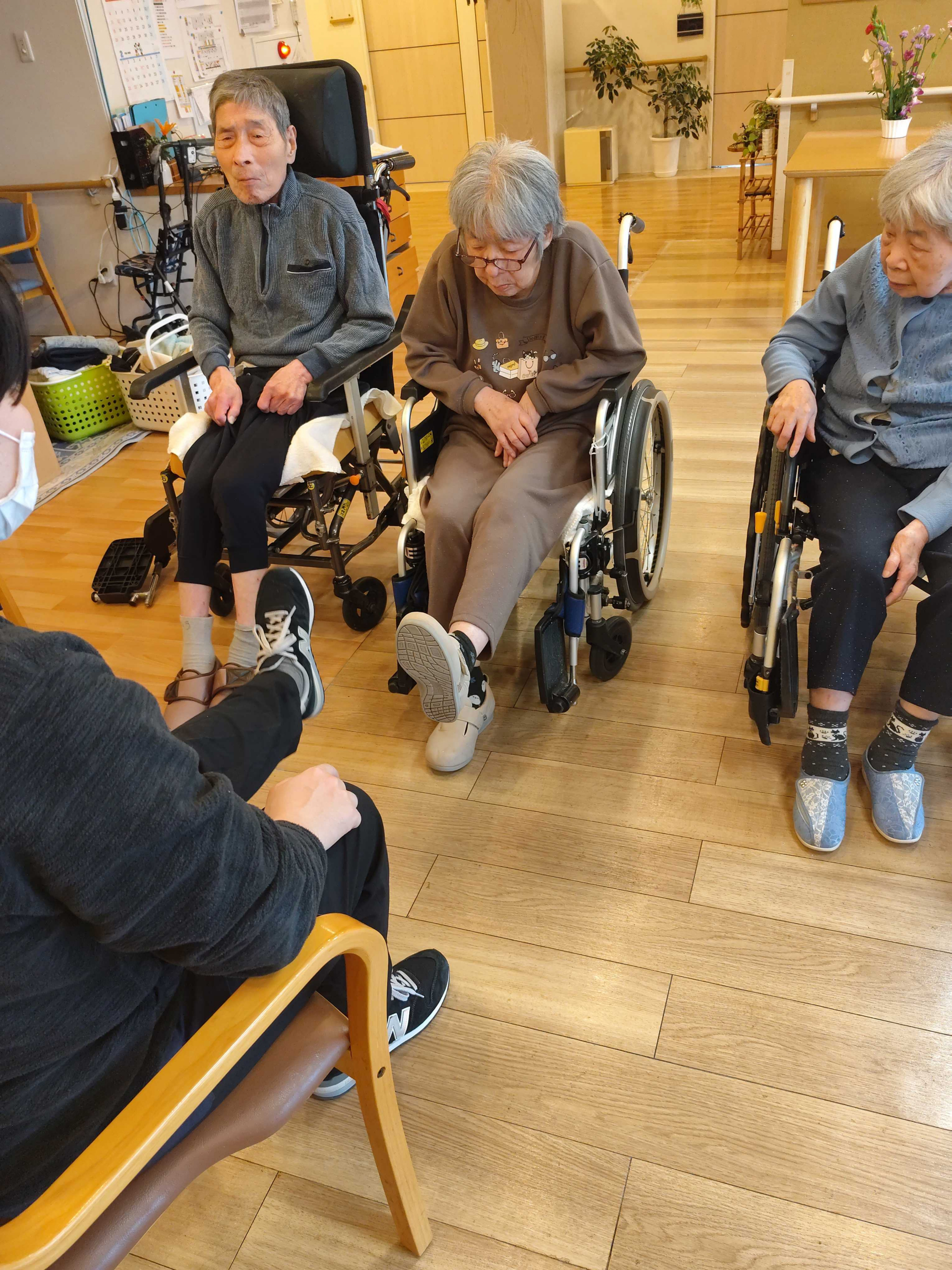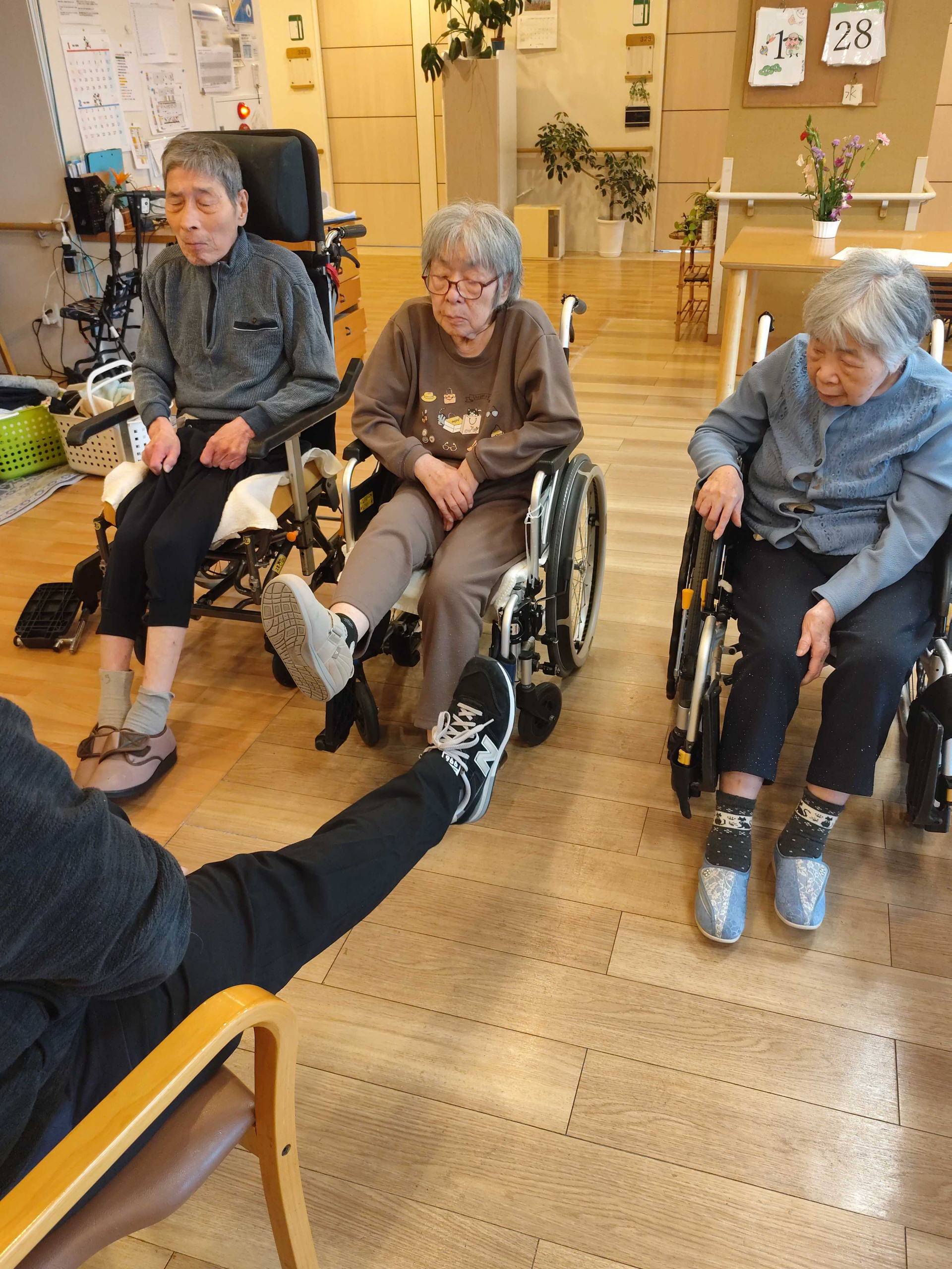皆さん、座ったまま足を上げる運動をしています。それぞれのペースで、ゆっくり体を動かしています。