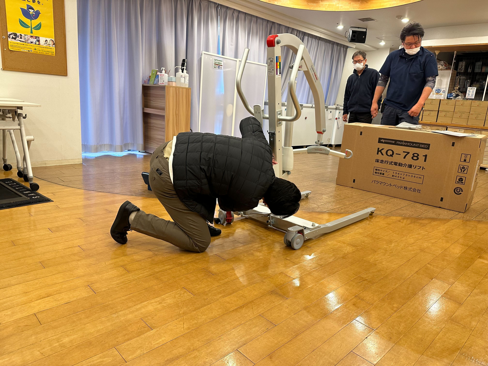 本日、走行式リフト導入に先たち、業者の方が来所し、リフトの使用方法や注意点等について説明してくださいました。