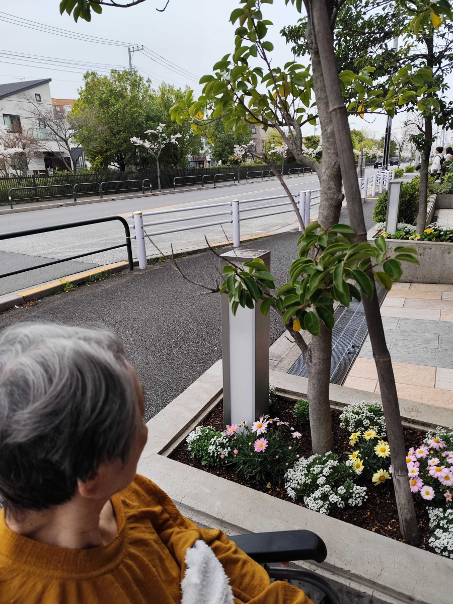 今日 、天気が良かったので、ご利用者様と一緒に施設の周りを散歩しました。