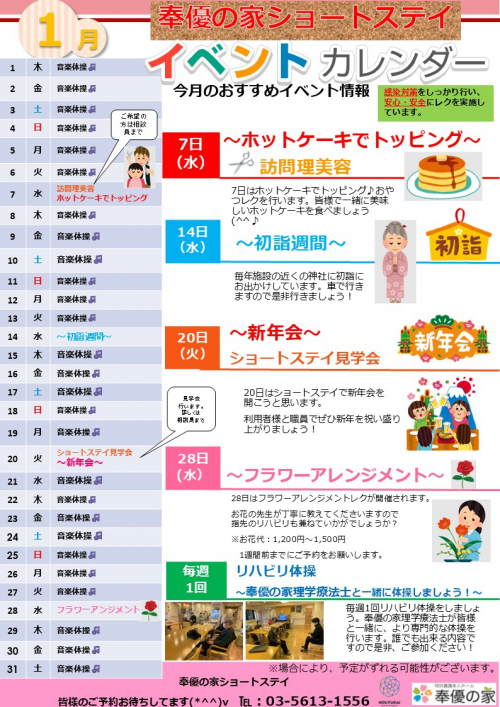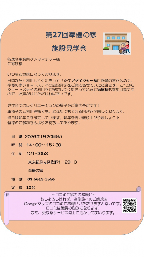 2026.01.27 ♦茶話会を実施しました♦ お食事 2026.01.26 【奉優の家ショートステイ見学会】 お知らせ 2026.01.26 2月イベントカレンダー お知らせ 2026.01.16 ♦美味しい食事♦2月の献立表を更新しました お食事 2026.01.11 1月佐野オレンジサロンのお知らせ 活動報告(IN) 2026.01.11 【奉優の家ショートステイ見学会】 お知らせ 2026.01.11 1月イベントカレンダー お知らせ 2026.01.03 元旦の昼食のご紹介 ショートステイ 2025.12.30 みんな大好きおでん ショートステイ 2025.12.29 奉優の家 ショートステイ空き情報 お知らせ 2025.12.29 ワンサービス課 元気に出勤 ショートステイ 2025.12.12 ♦1月の献立を更新しました♦ お食事 2025.11.25 食後の跡の運動 ショートステイ 2025.11.19 ♦今月のオレンジサロンのご案内♦ お食事 2025.11.18 2025年11月18現在 奉優の家ショートステイ空き状況 お知らせ 1 2 3 … 25