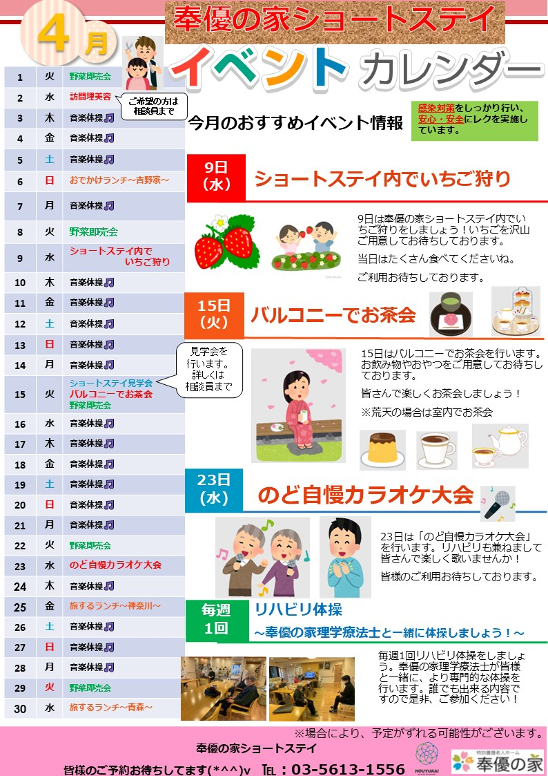 2025.03.30 お知らせ 4月イベントカレンダー Tweet シェアする 皆様こんにちは!! 奉優の家ショートステイは4月も楽しいイベントをたくさん企画していますのでぜひご利用ください! 支援課 五十里 前の記事 2025.04.06 お知らせ 2025.4.6現在 奉優の家ショートステイ空き情報 次の記事 2025.03.30 お知らせ 【奉優の家 ショートステイ見学会】 一覧へ戻る