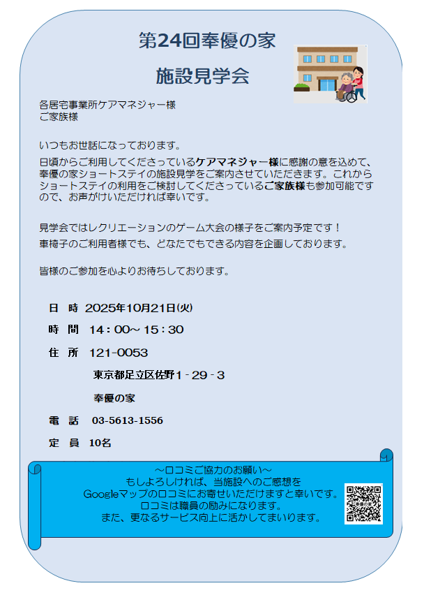 10/21(火)は奉優の家ショートステイの施設見学会を実施いたします。