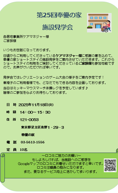 11/18(火)は奉優の家ショートステイの施設見学会を実施いたします。