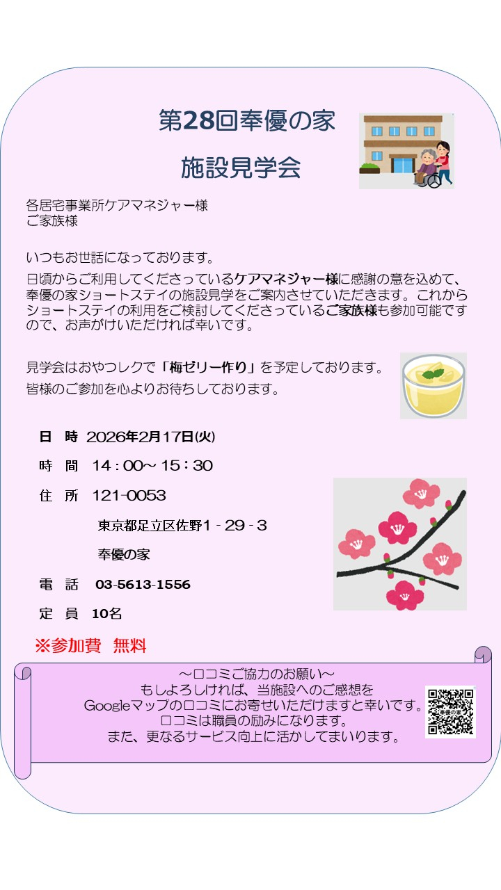 2/17(火)は奉優の家ショートステイの施設見学会を実施いたします。