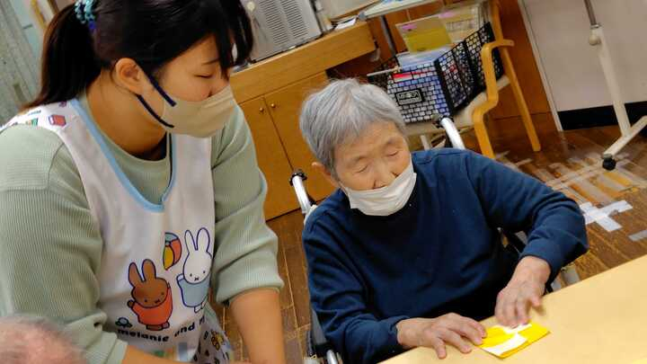今日は秋の歌を歌ってくれた後、折り紙を教えてくれました。折り紙でドングリや栗をつくりました。園児のみなさんが一生懸命におり方を教えてくれ、ご入所者様も真剣につくり大きな栗の木の完成です!
