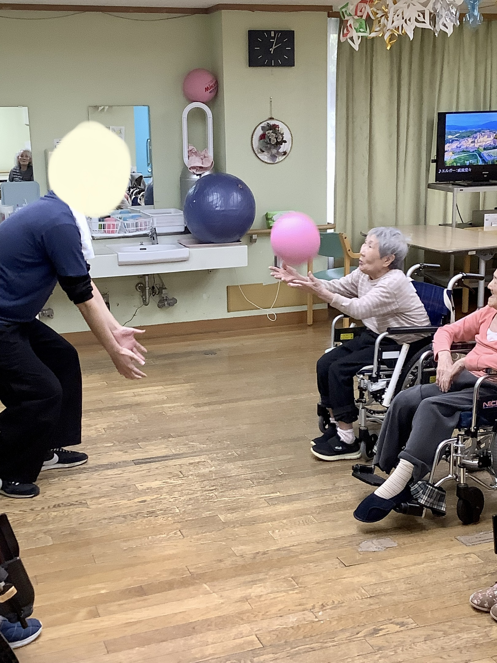 そんな寒い中ご利用者様にボールを使ったレクリエーションを参加してもらいました。