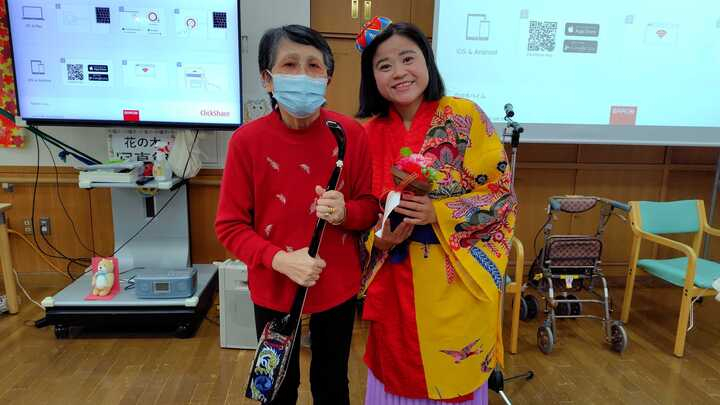 沖縄三線の音楽に合わせて「島唄」が始まると「知ってる知ってる!」と歌われる方がたくさんいらっしゃいました!沖縄の唄だけでなく、唱歌なども。5月という事でこいのぼりを歌いました。