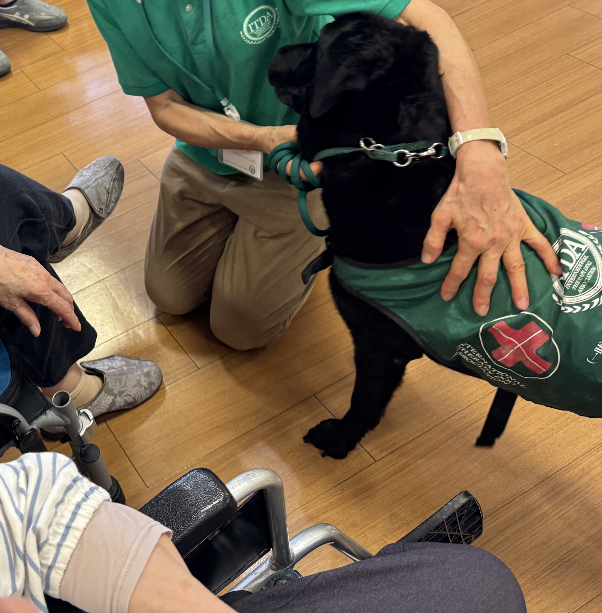 施設内は一気にやさしい空気に包まれ、ご利用者の皆さまも自然と笑顔に。今回のふれあいには、ショートステイご利用中の方も参加され、わんちゃんとの時間を心から楽しんでいらっしゃいました。