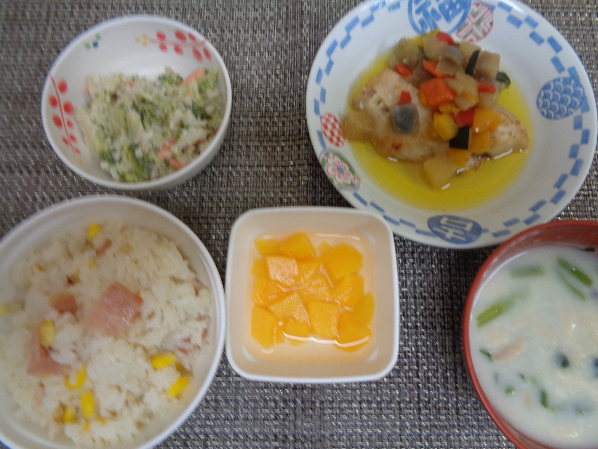 コーンご飯、赤魚の夏野菜ソース、サラダ、クリームスープです。