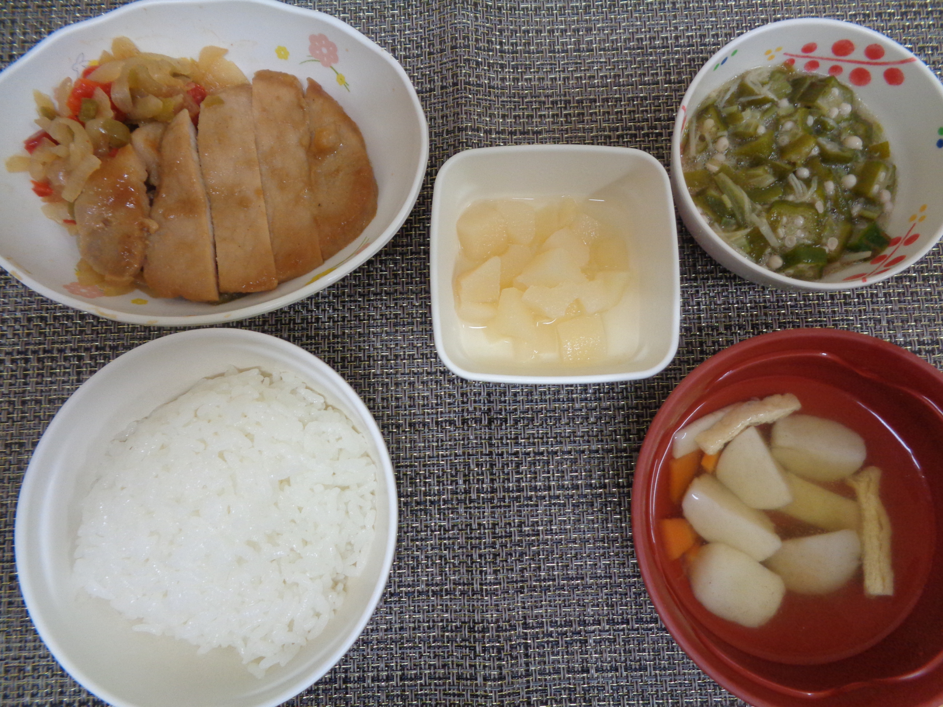 ご飯、豚の味噌漬け焼き、オクラの和え物、五品目清汁、洋梨缶でした。