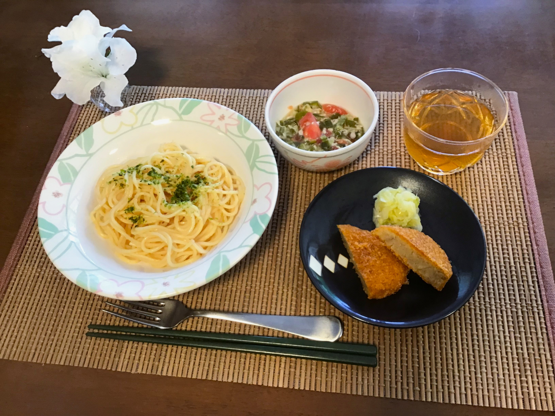 たらこバタースパゲティー、コロッケ、オクラの酢の物です。