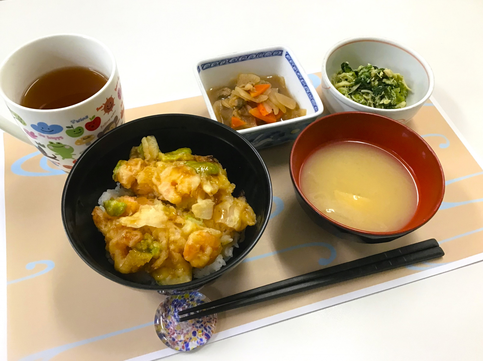 2025.05.24 お食事 春のどんぶりランチ Tweet シェアする 今月のリクエストメニューは、どんぶりです。海老とそら豆のかき揚げ丼、あさりと大根の炒め煮、菜の花のからし和え、汁物です。味が染みたかき揚げを堪能されました^^ 支援課K 前の記事 2025.05.24 お食事 おやつ後の過ごし方 次の記事 2025.05.23 お食事 みんなで体操をしました! 一覧へ戻る